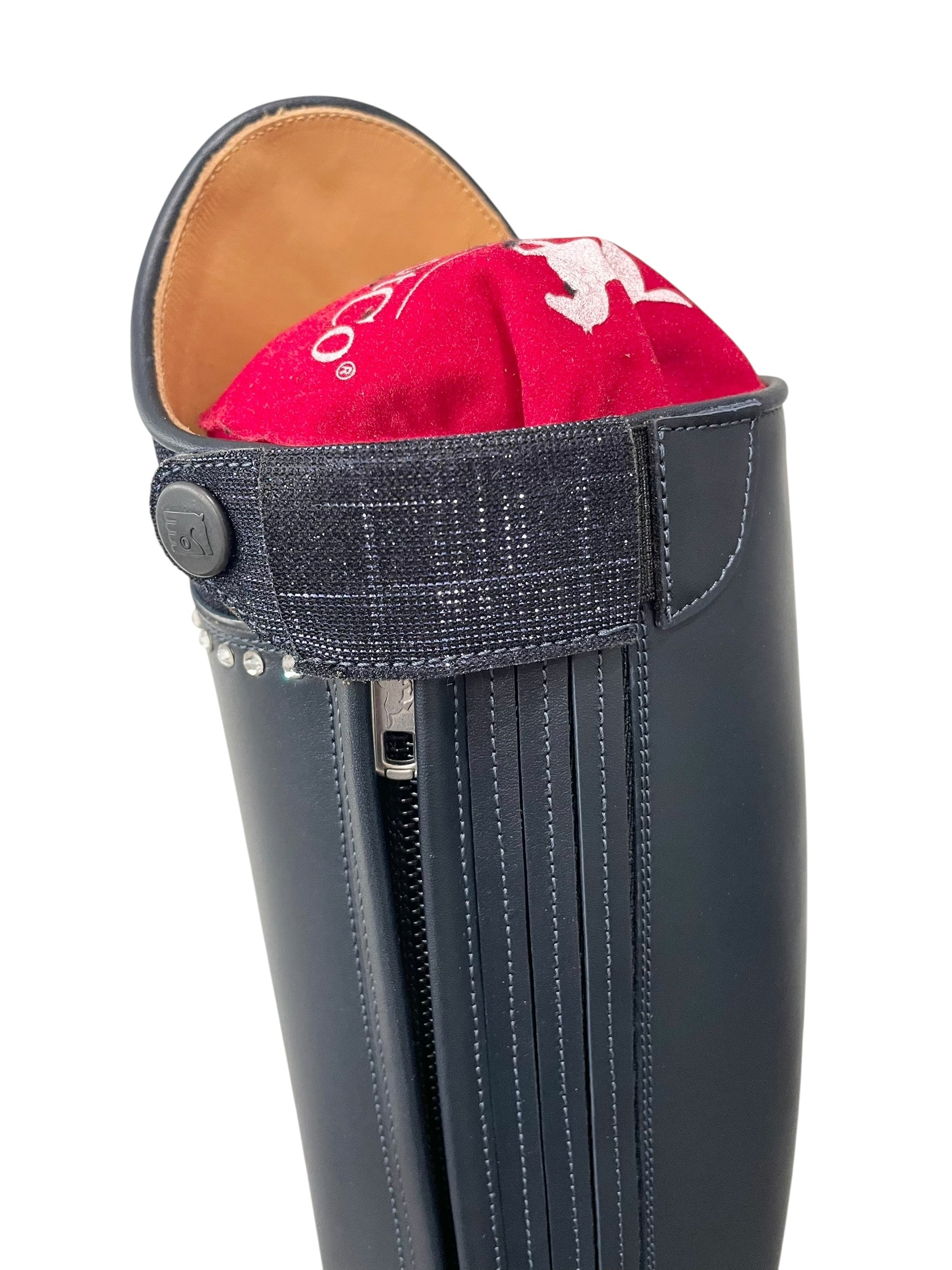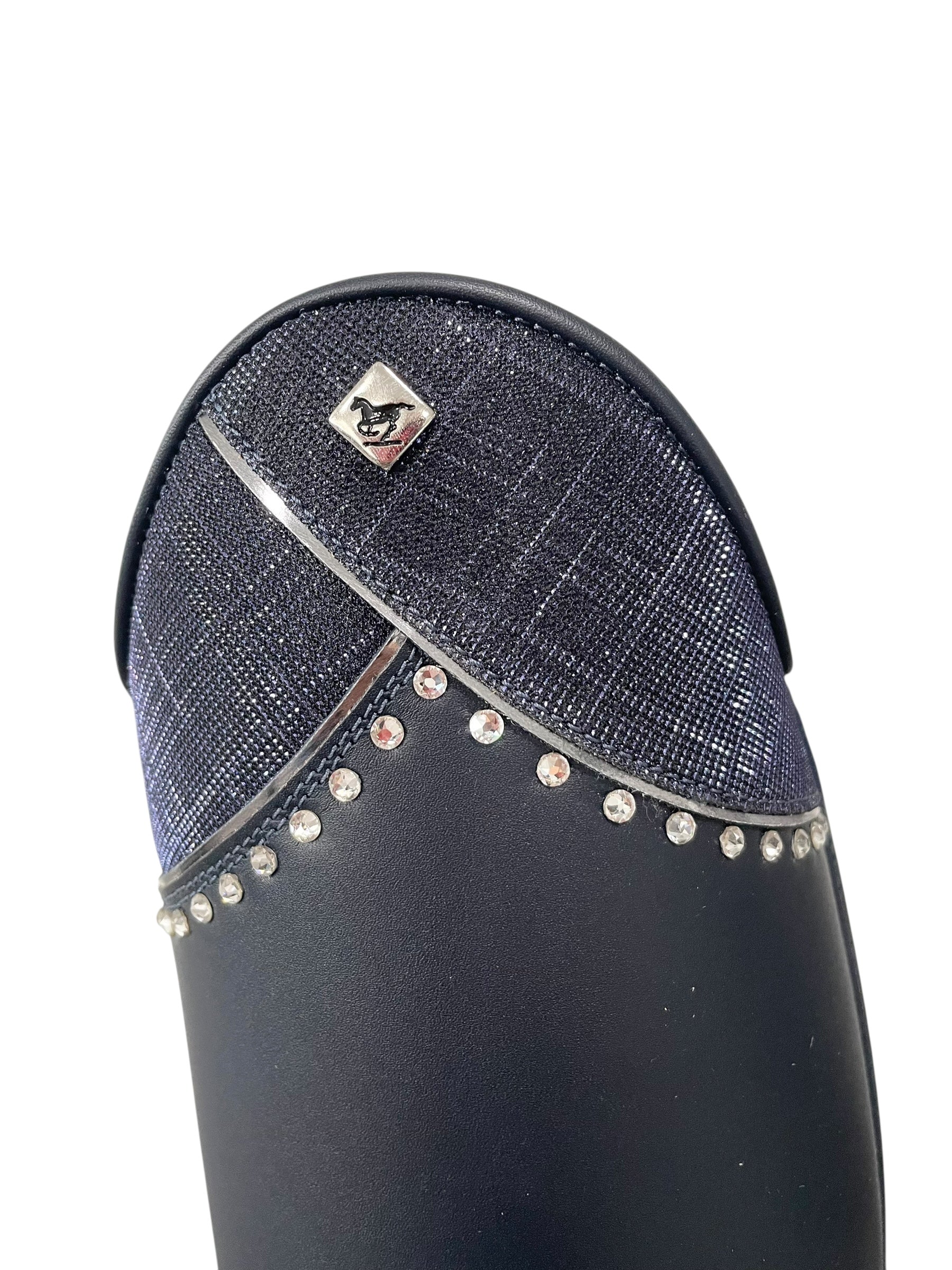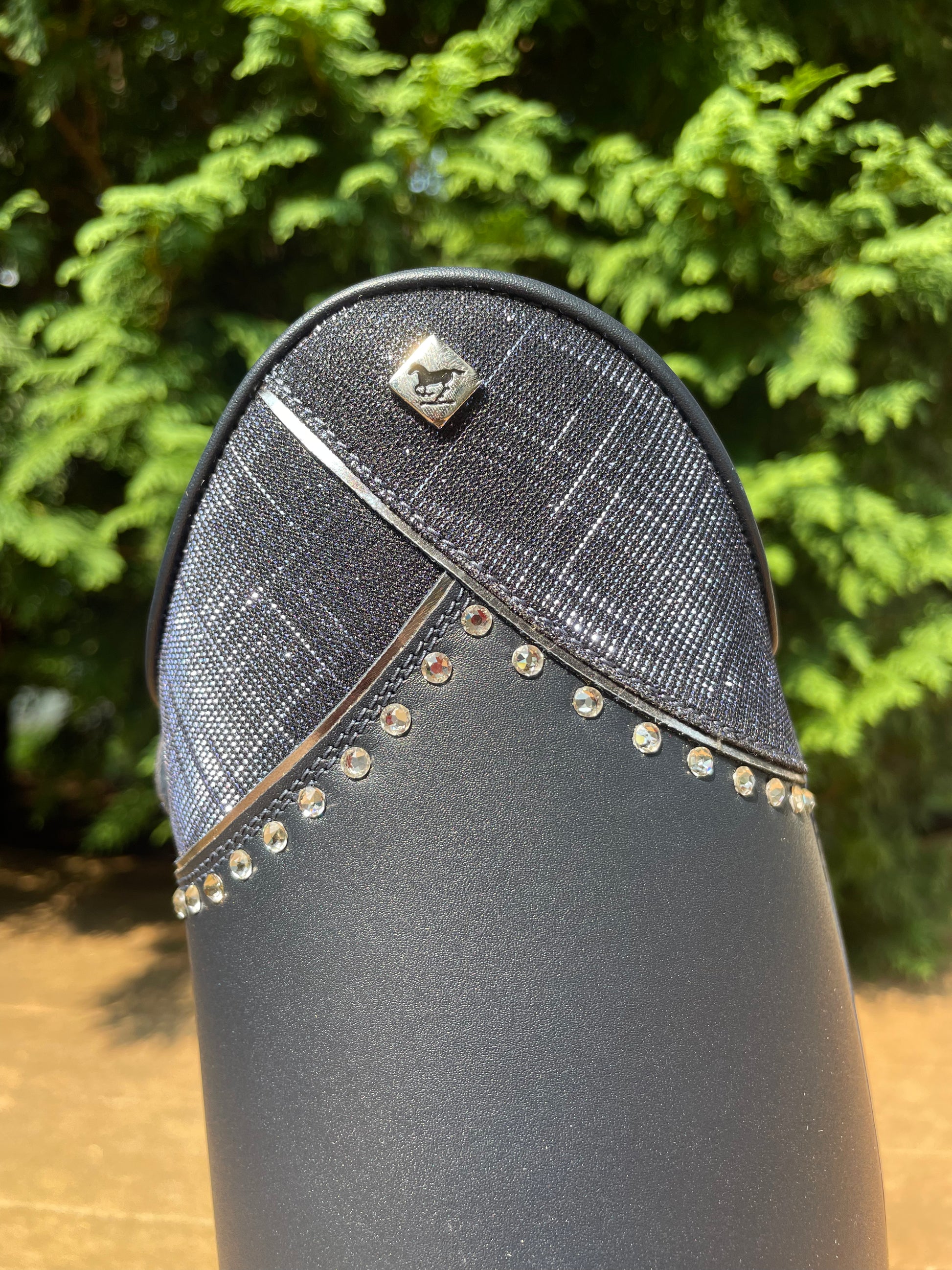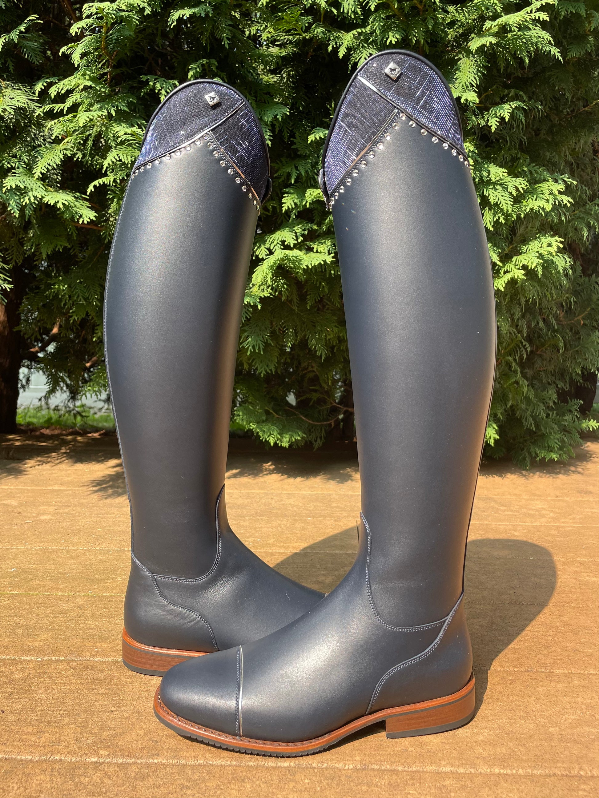 Description: WRAT indaco base, G35 musa top in iride oceano with GG08 Swarovski crystals and specchio iron piping, E4 toecap in WRAT indaco with specchio iron piping, Q7 inside shaft in WRAT indaco, Q16 6 cm bow, silver logo, and brown outsole.
