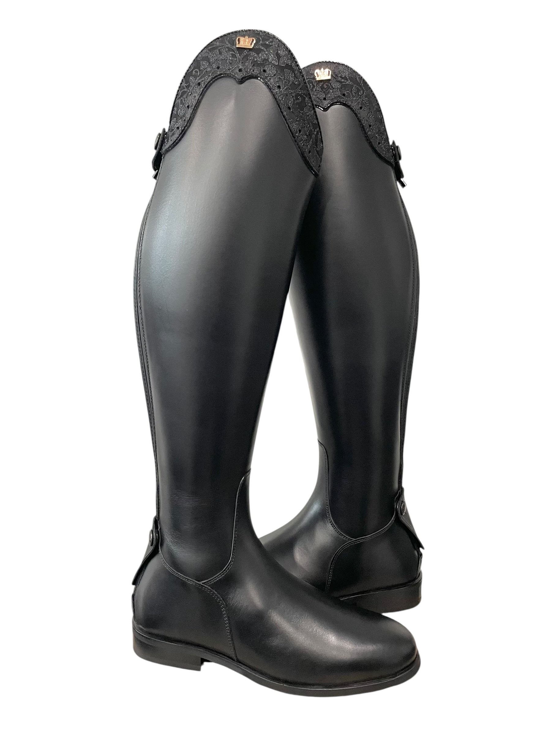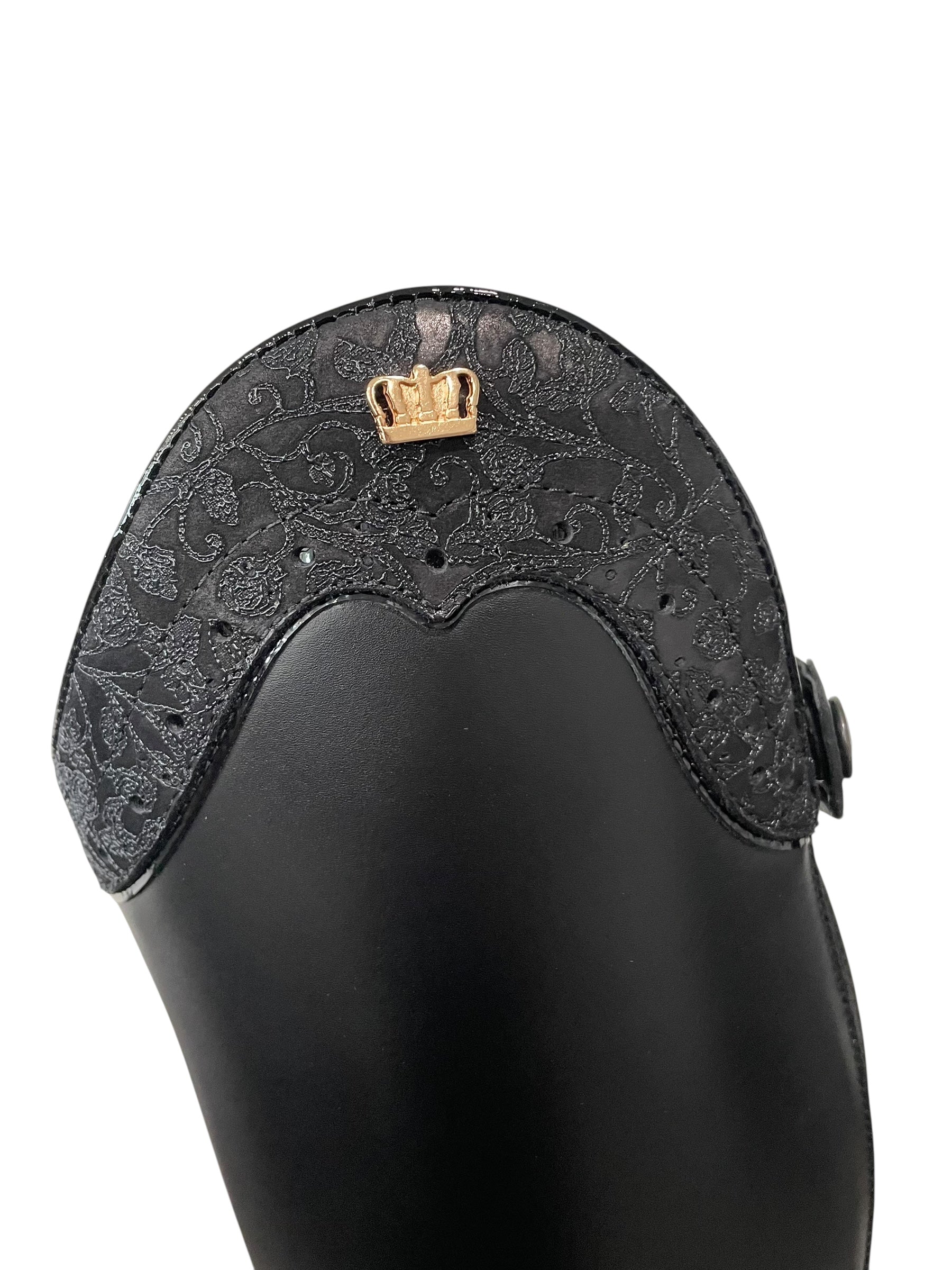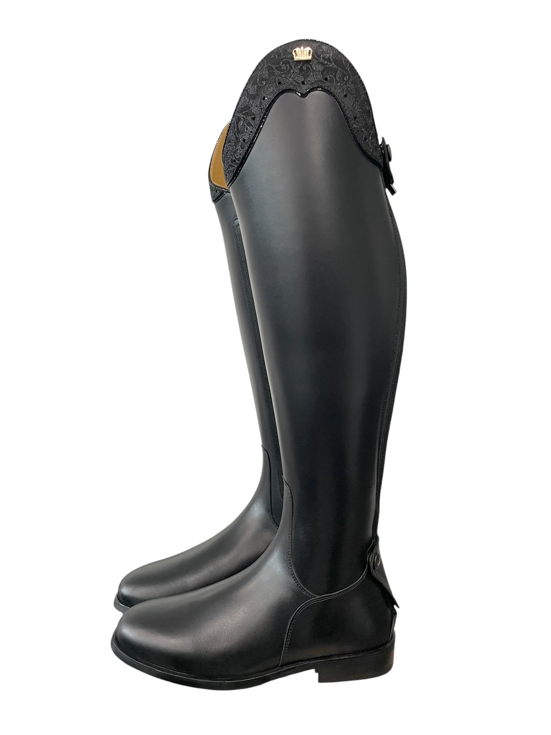 Description: Nature black base, Ziva top in elba with brogues and roma black piping, rose gold logo crown, black elastic, and black outsole.