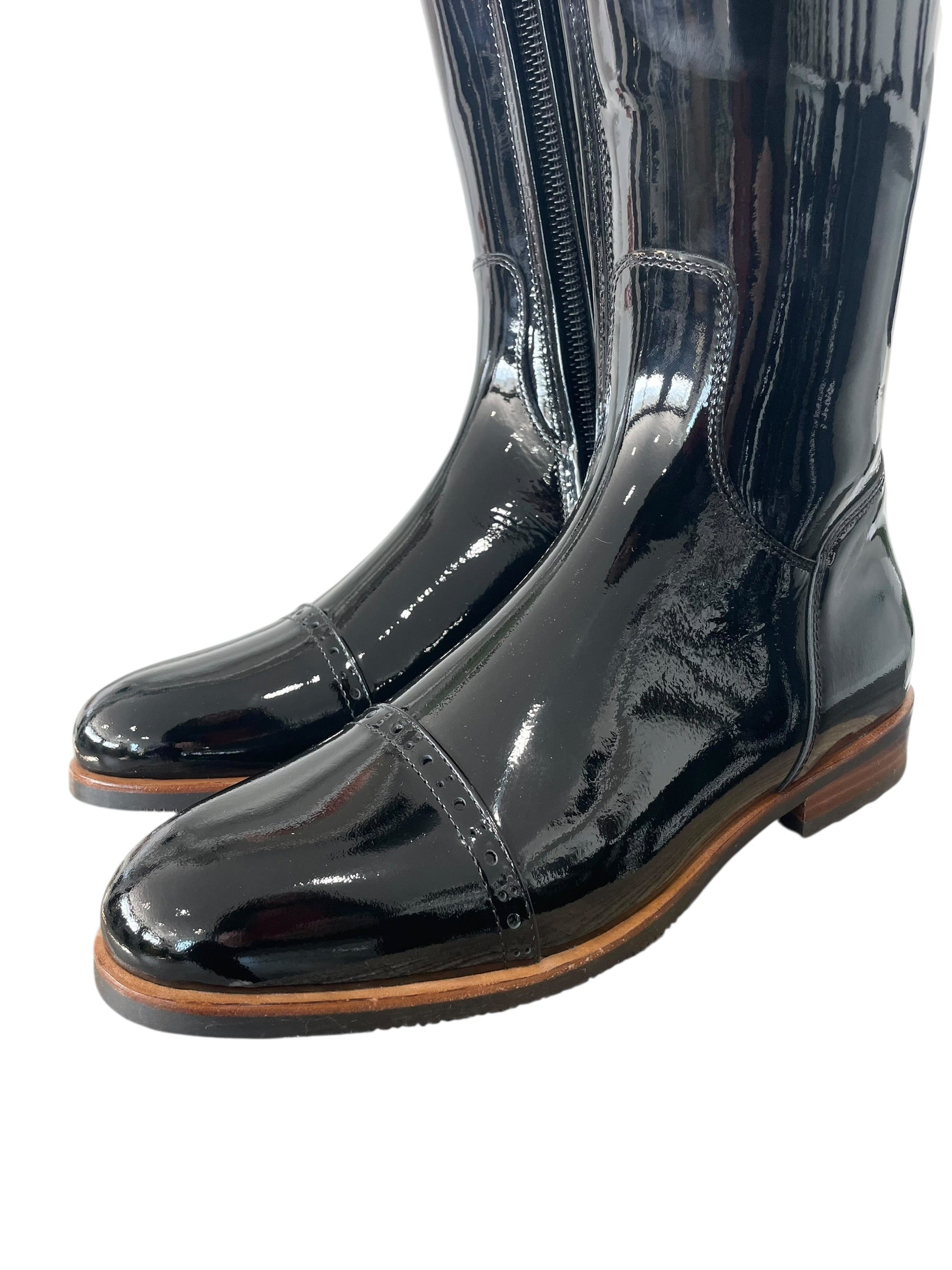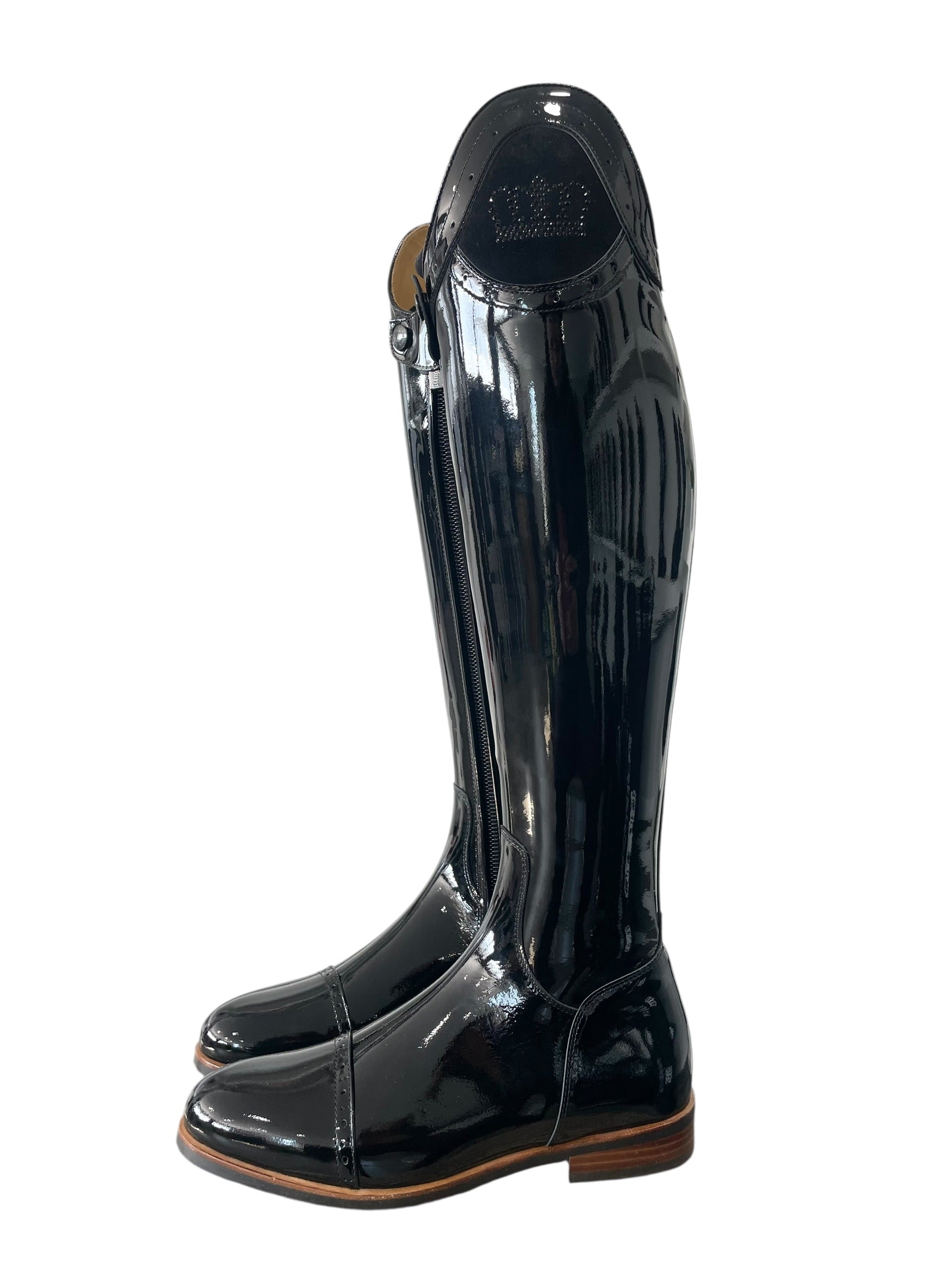 Description: Roma black base, toecap with brogues, soft knee back option, Eve top in waterproof black suede with black Swarovski crystal crown, nature black inside shaft with V-gusset, polished black logo crown, and brown sole.