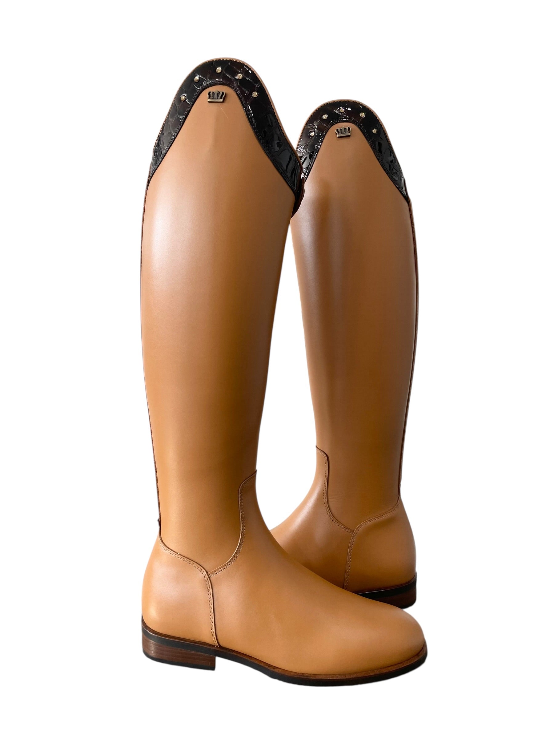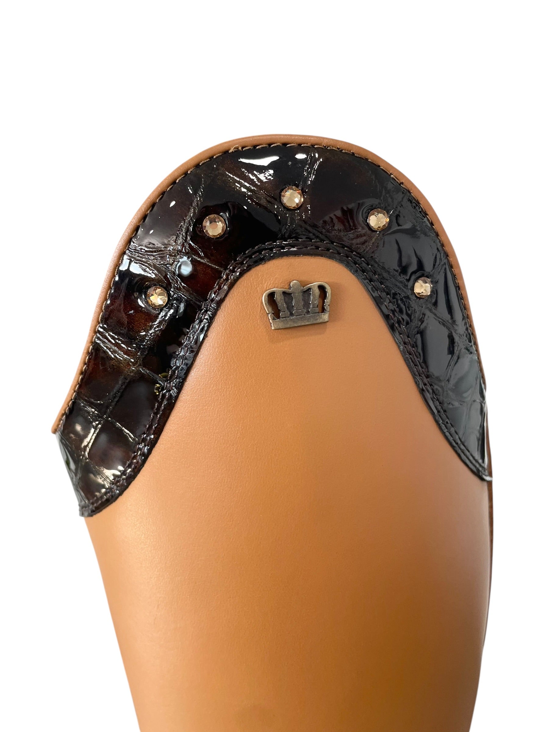 Description: Aspen cognac base, Jenny top in croco bril castanho, old gold logo crown, and brown sole.