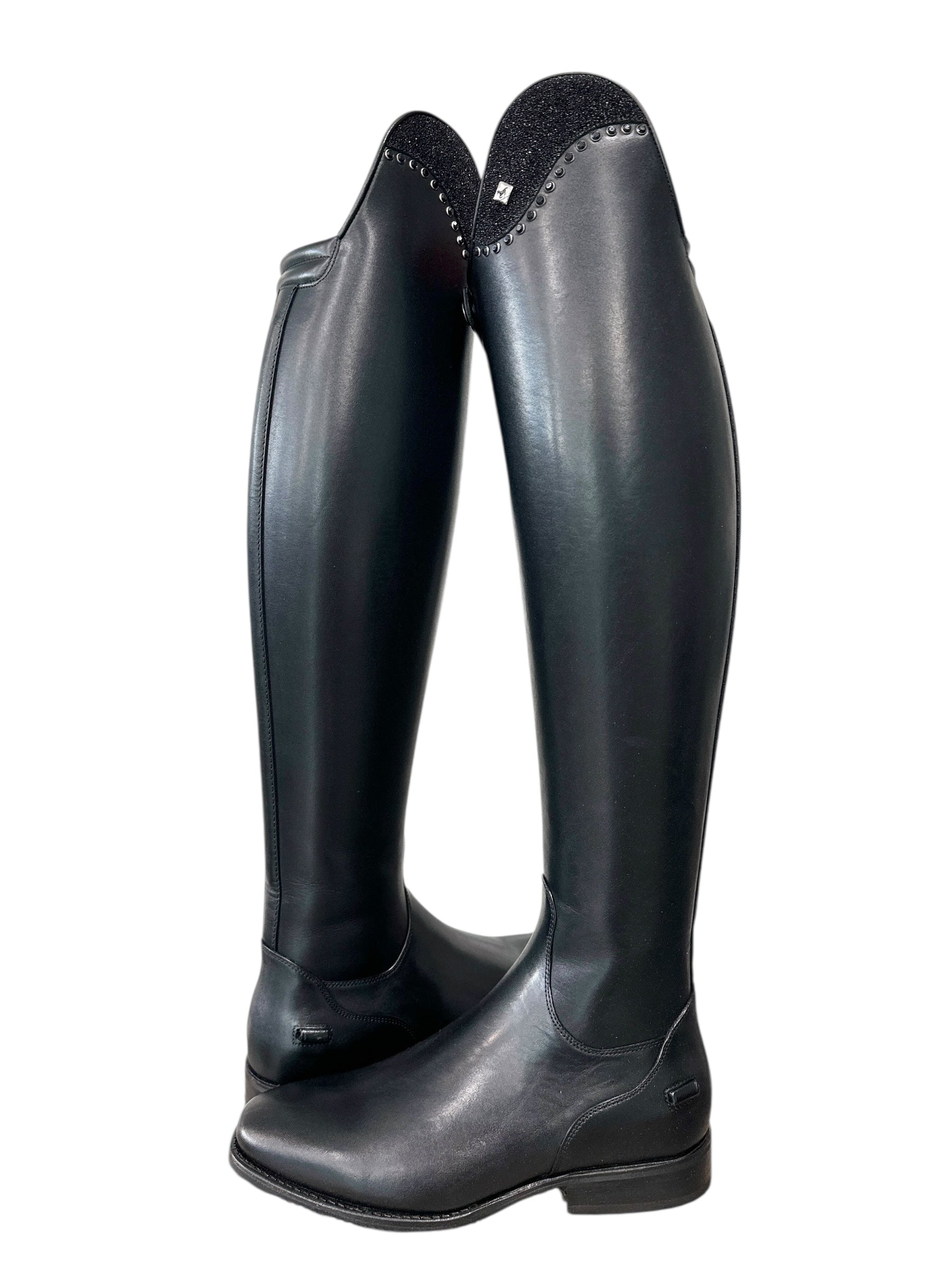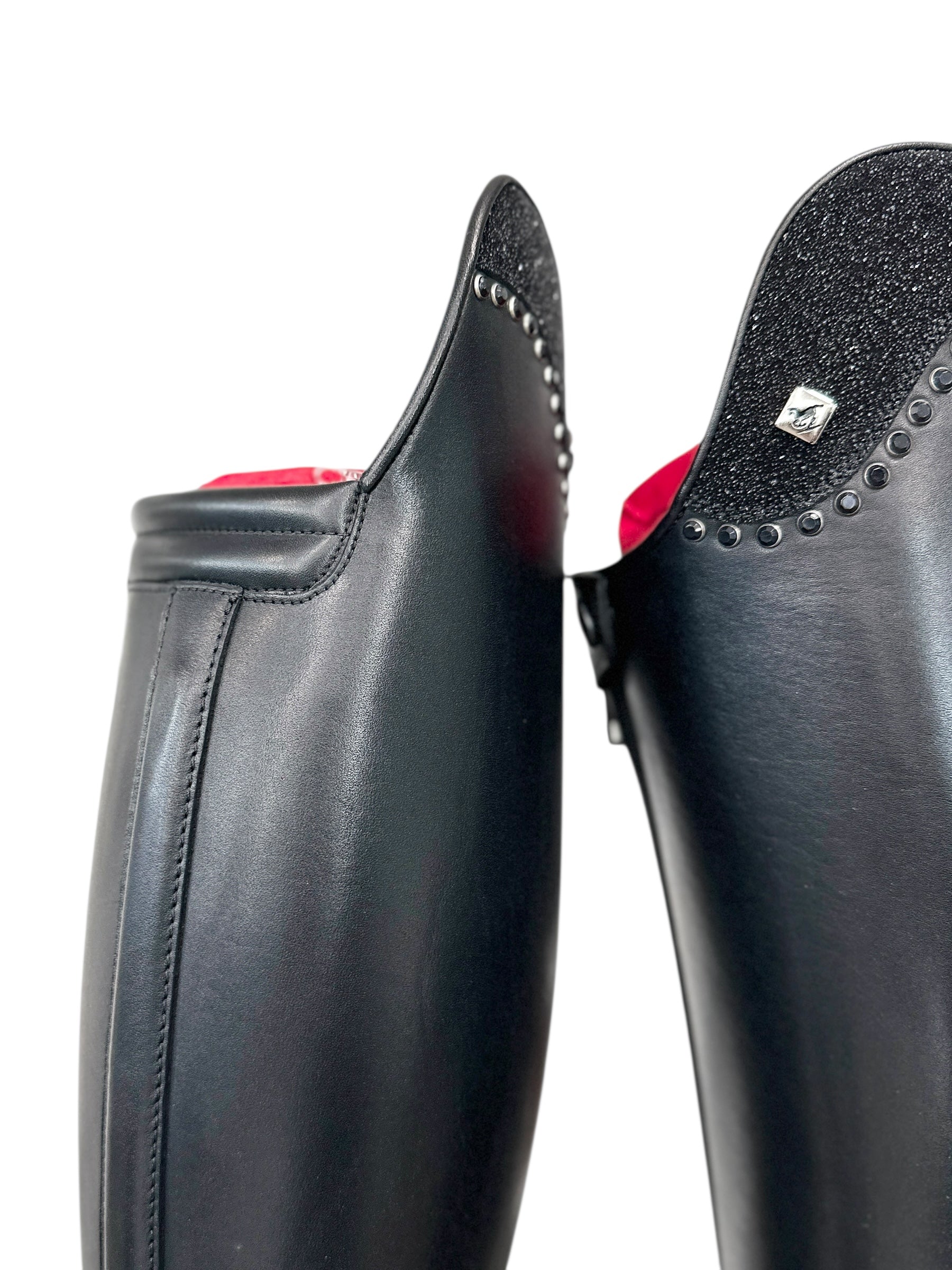 Description: WRAT black base, G21 Up-Top top in stardust black with GG08 RSWB black 5.2 mm crystals set 3 mm apart, Q13 comfort knee, silver logo, and black outsole.