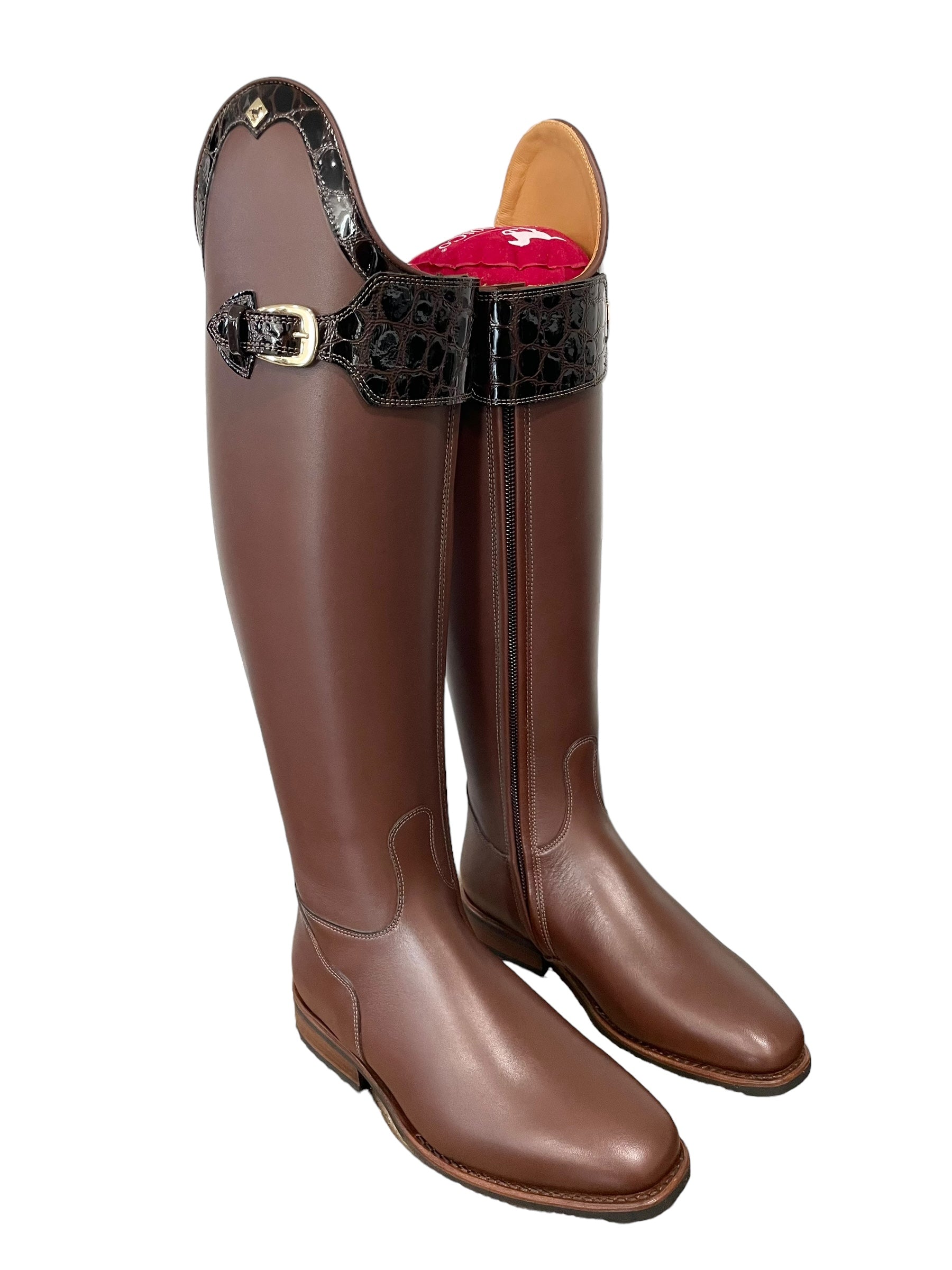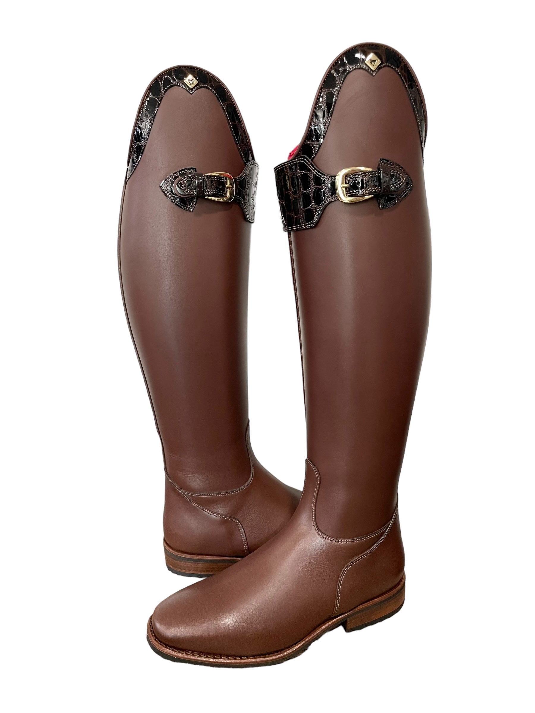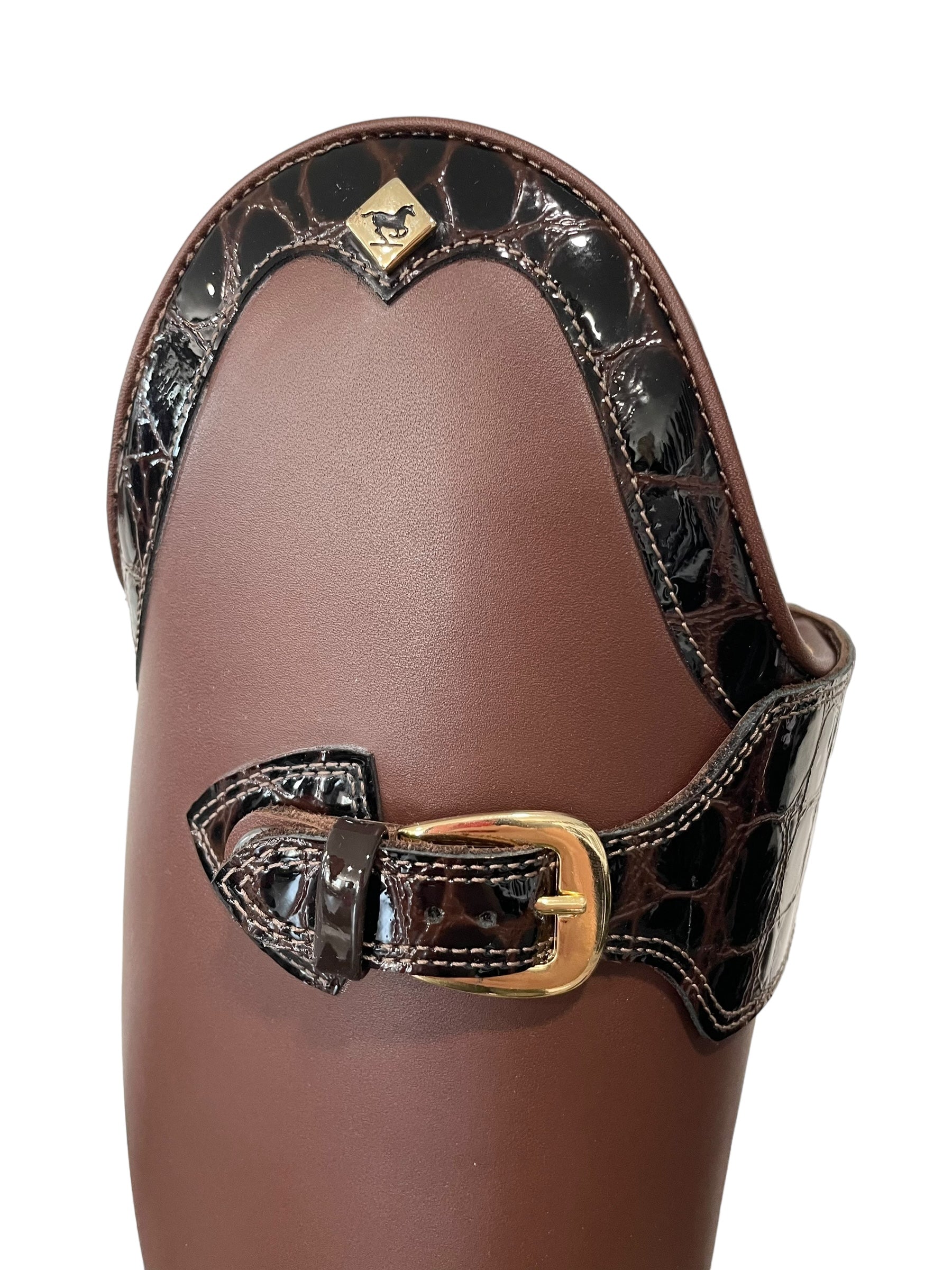Description: WRAT brown 527 base, G9 Rondine top in lucidi moka, top strap in lucidi moka with oro buckle, oro logo, and brown outsole.