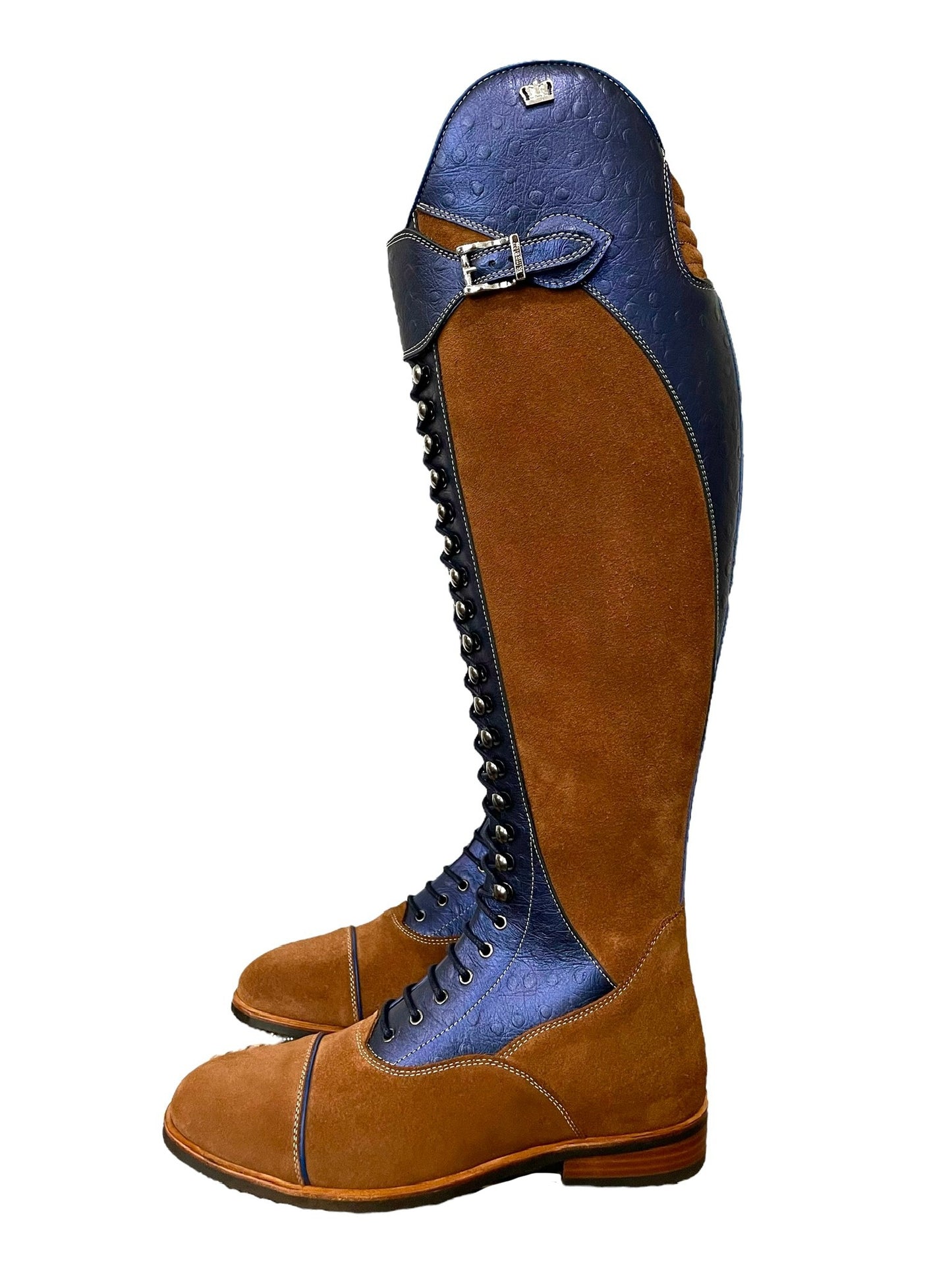 Description: Cognac suede base, comfort knee option, creme stitching, ostrich blue instep and parts under the laces, ostrich blue zip protector, nature cobalto parts along the zipper and back stripe, blue pilota laces, paula top in ostrich blue with nature cobalto top piping, nature cobalto inside patch, toecap with nature cobalto piping, silver logo crown and buckles, and brown outsole.