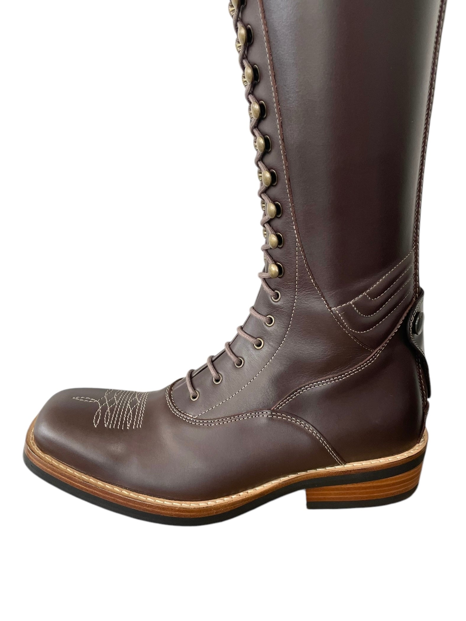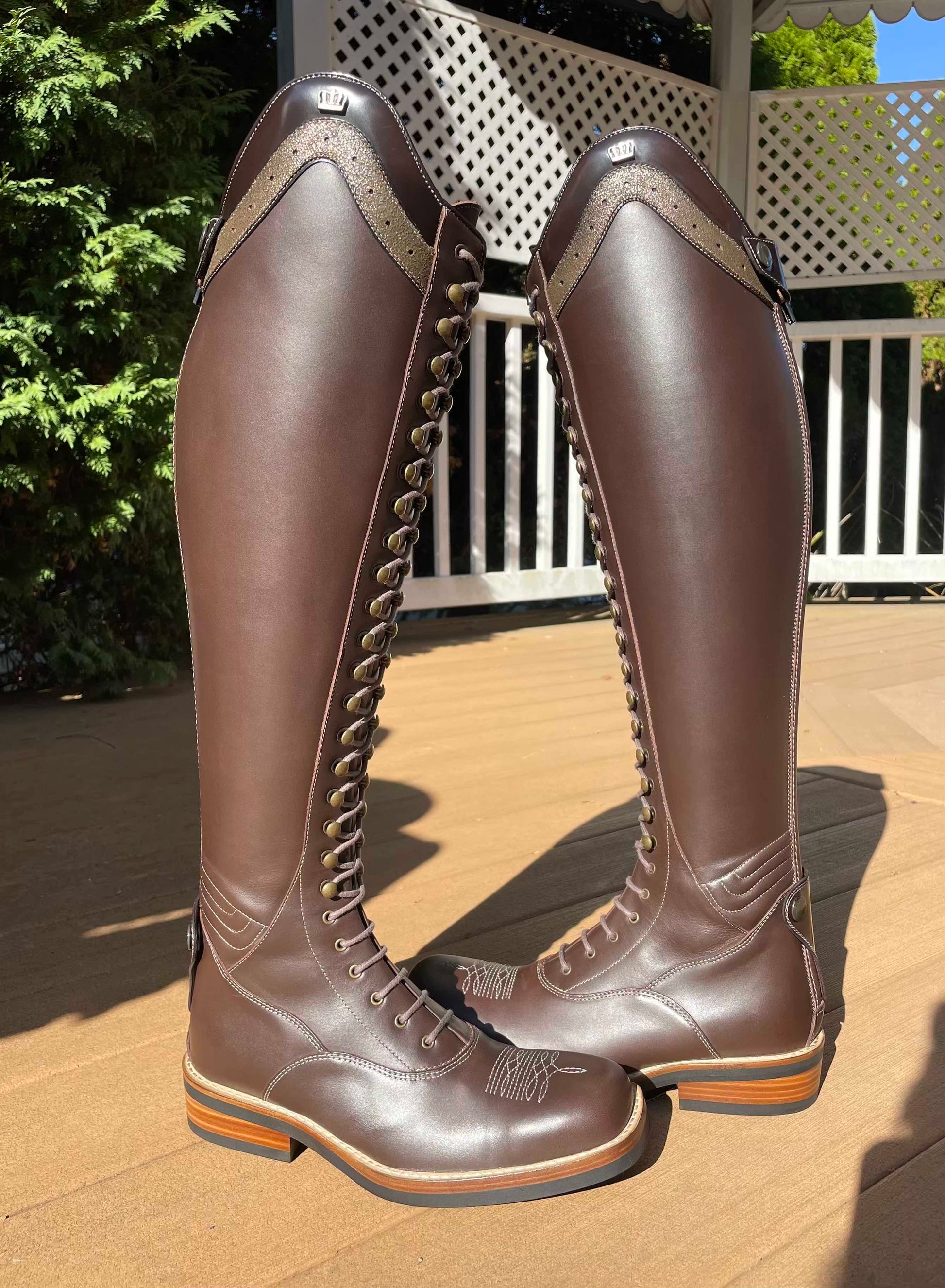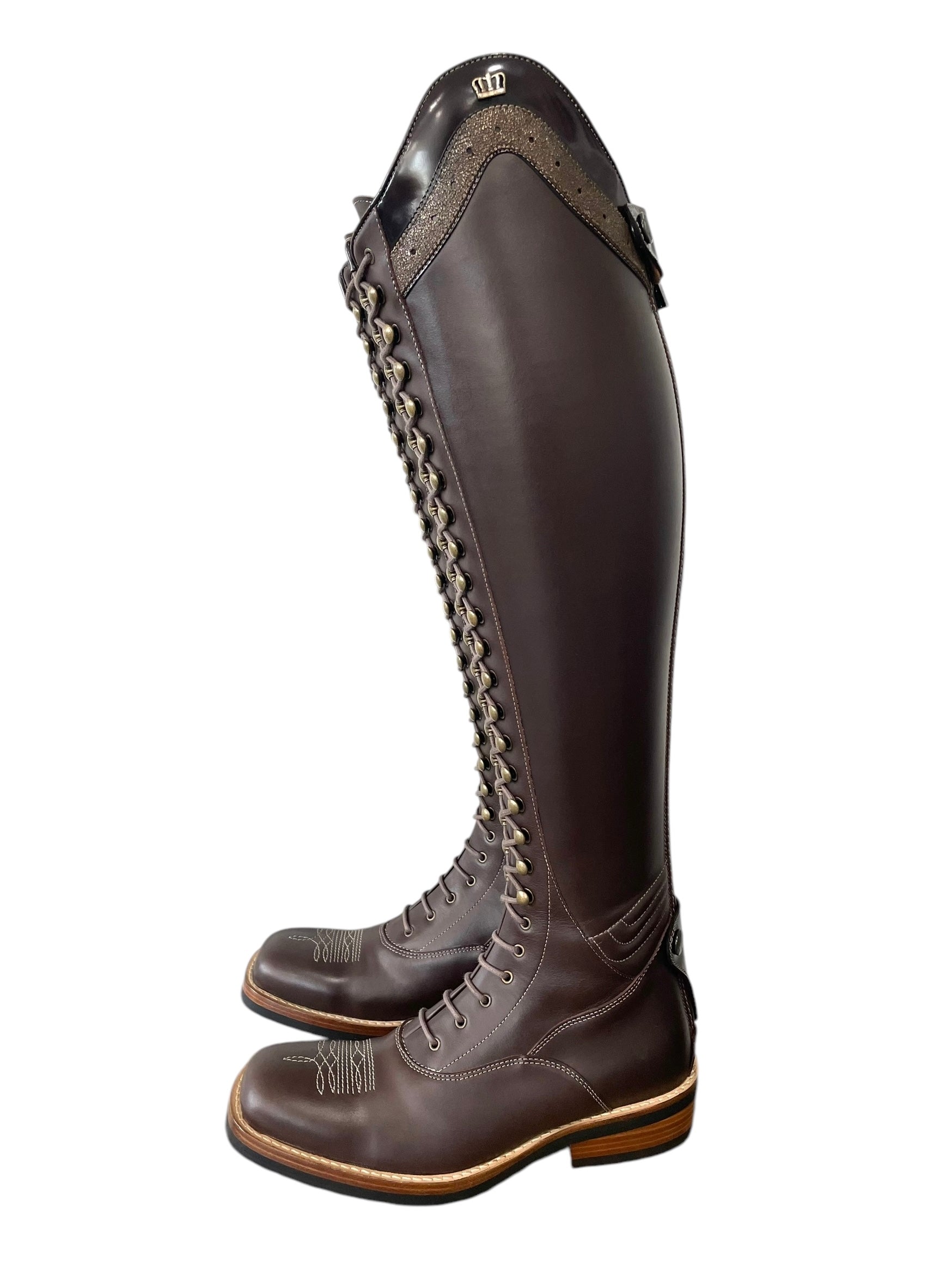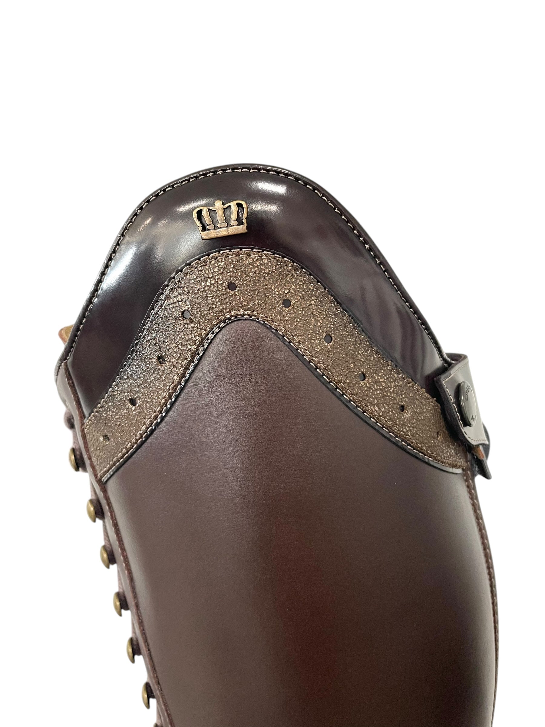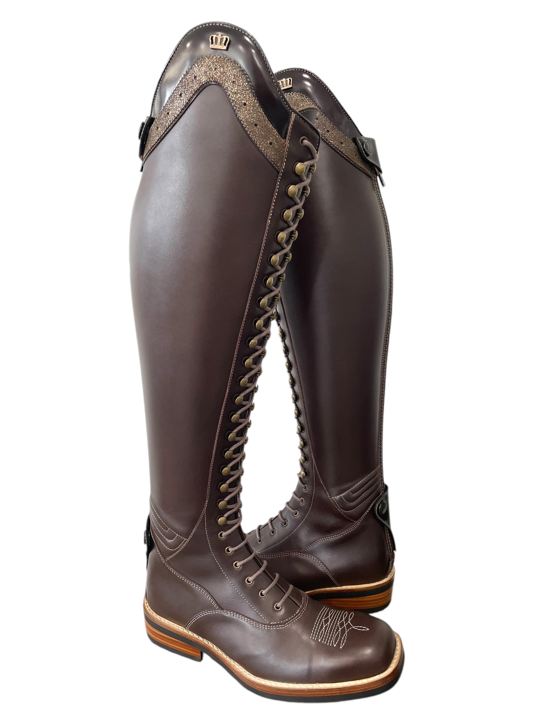 Description: Nature brown base, uragano dark brown zip protectors, Jenny top in crute taupe and uragano dark brown with uragano dark brown piping, taupe Denver stitching on the toe, brown Denver sole, taupe laces, and old gold logo crown.