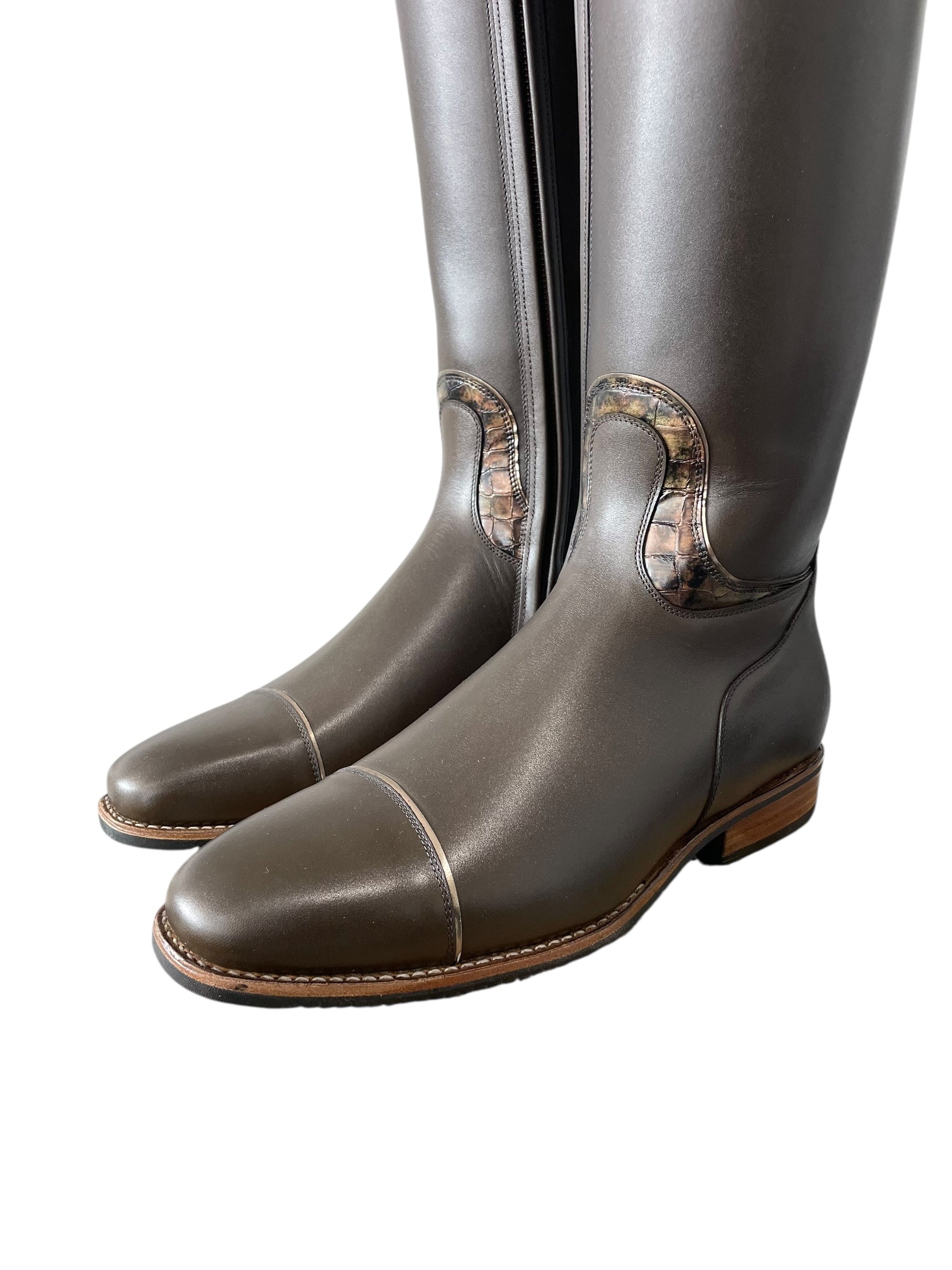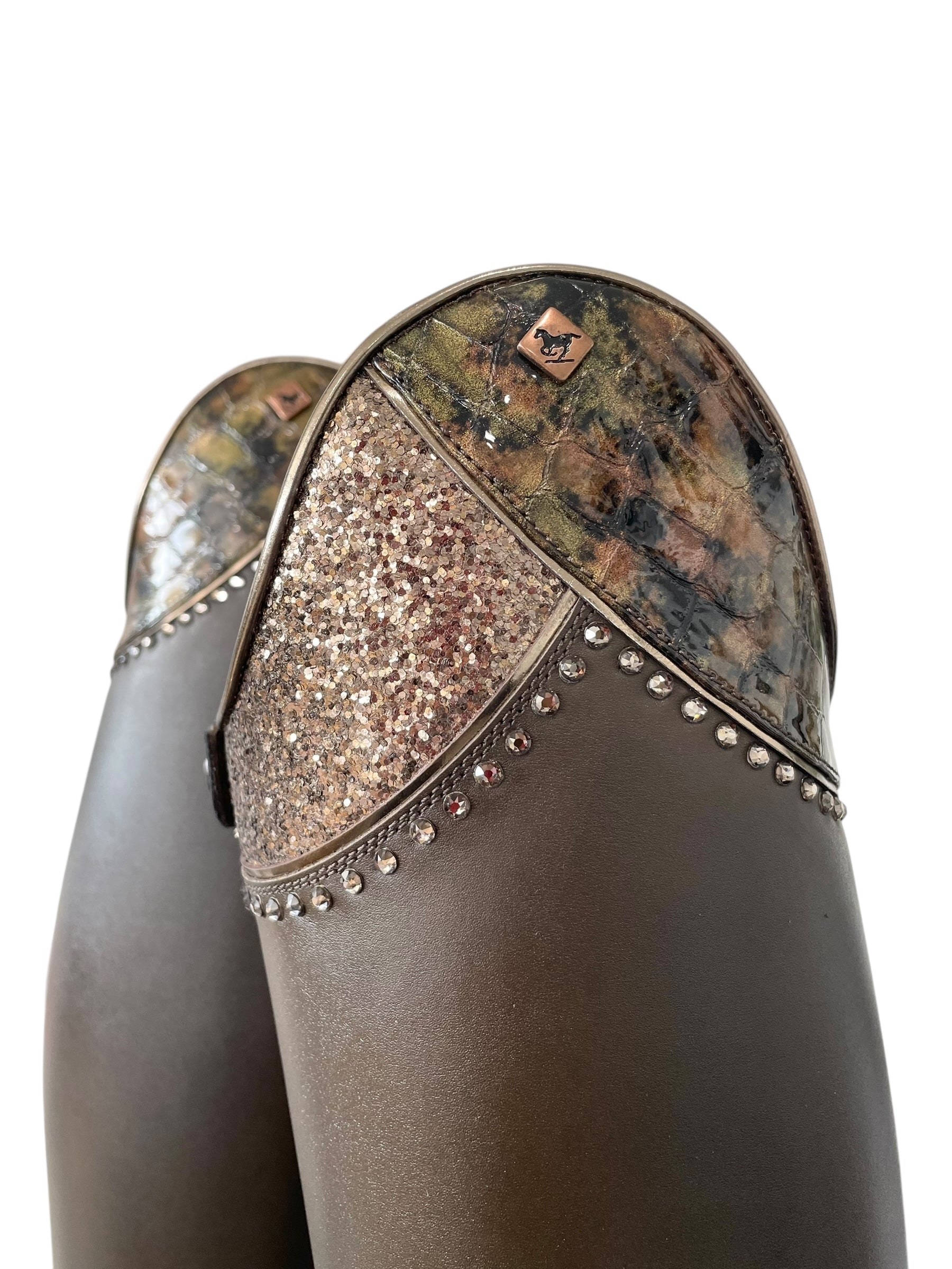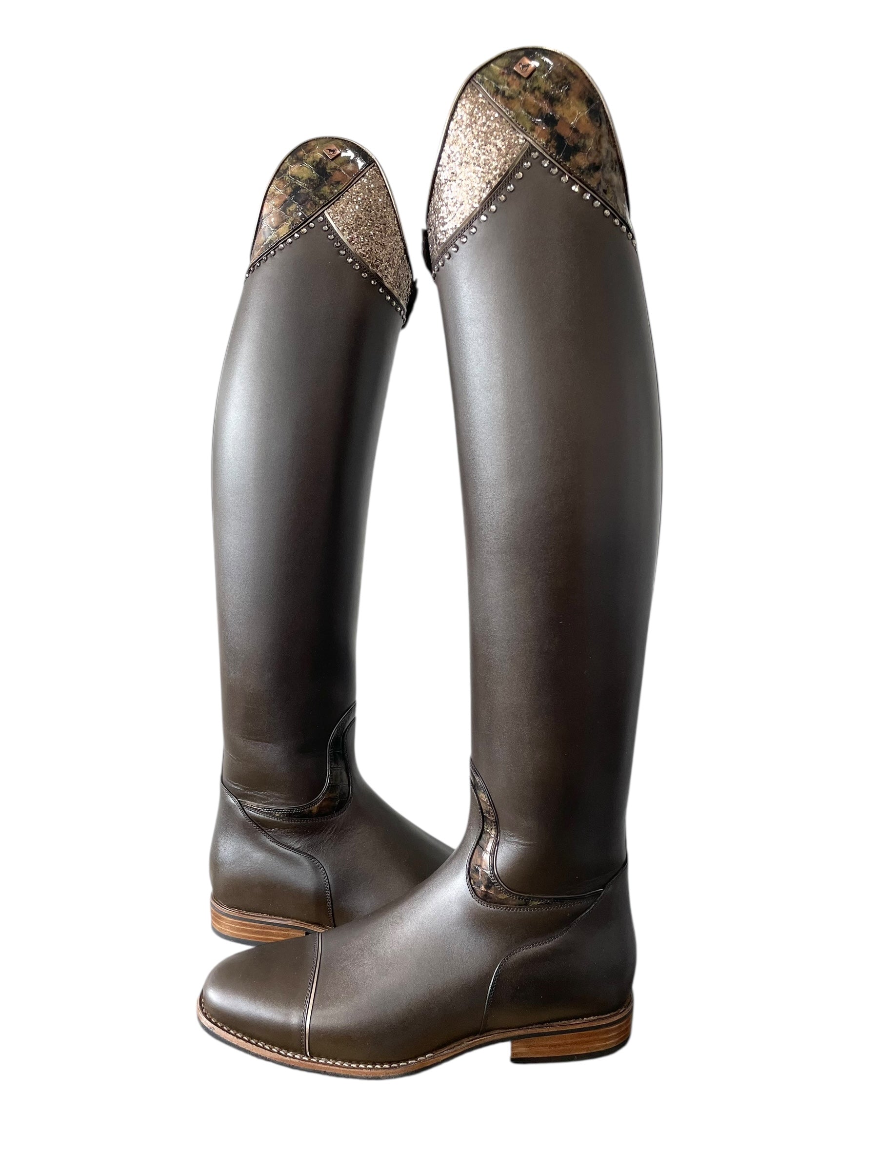 Description: Vintage do green base, G35 Musa top in lucidi sfumato oro (big section) and gala gold (small section) with GG08 SS15 griege 3.8 mm Swarovski crystals and specchio platino piping, E4 toecap with specchio platino piping, frame around instep in lucidi sfumato oro with specchio platino piping, top zip protector in lucidi sfumato oro, corten logo, and brown sole.