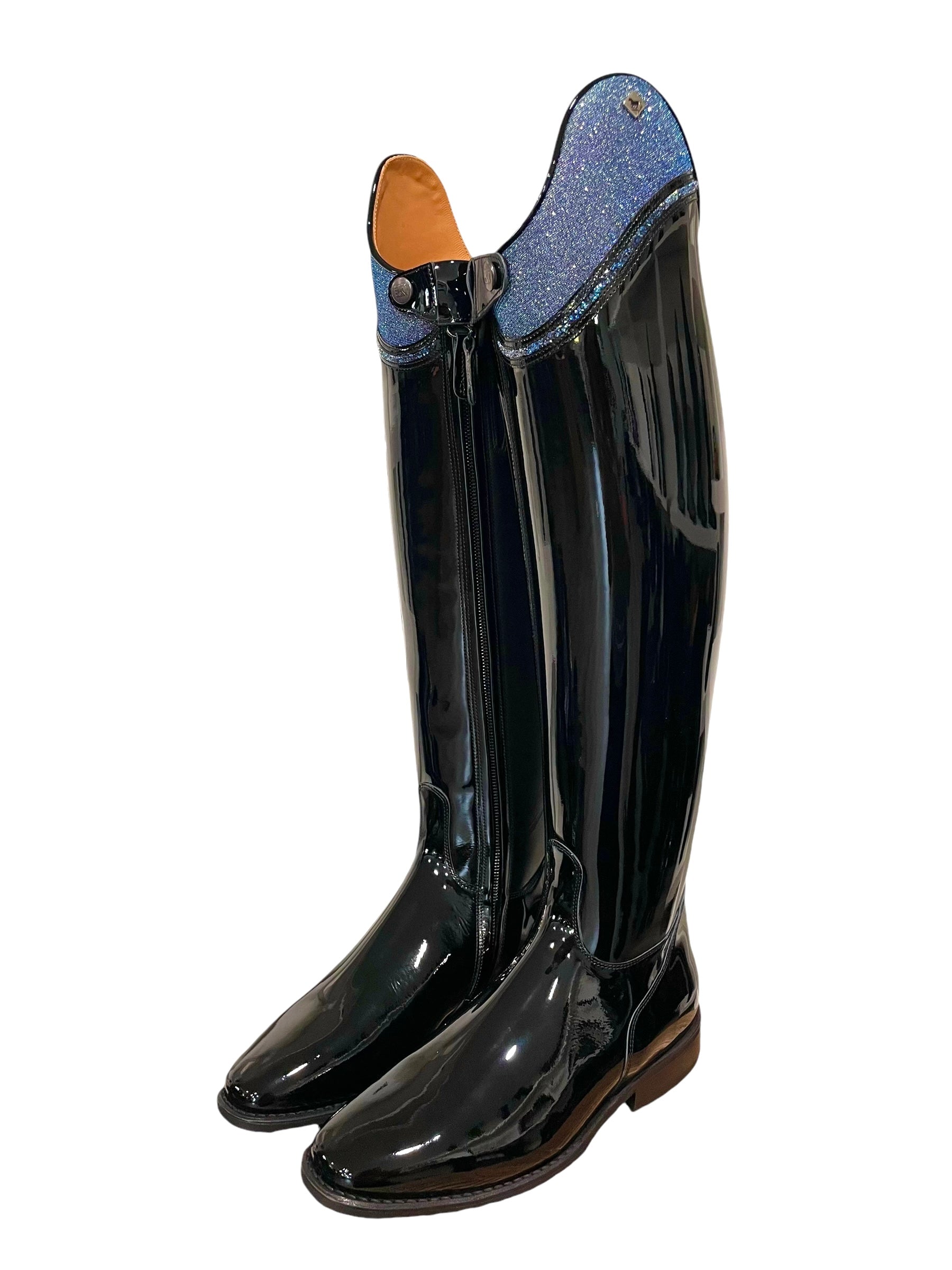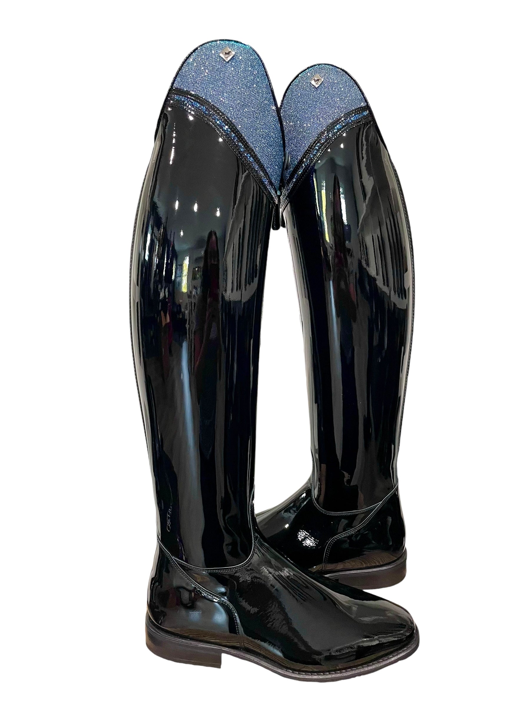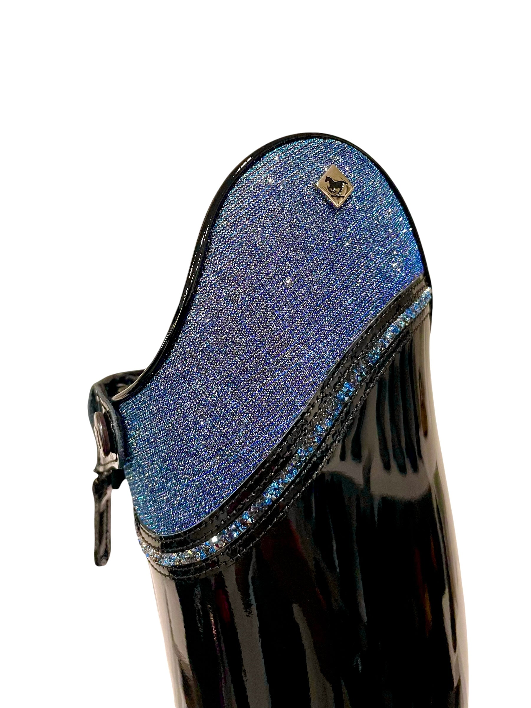 Description: Patent black base, G25 Lisa top in iride notte with band of GGS73 SW cry fine mol blue crystals, silver logo, and black outsole.