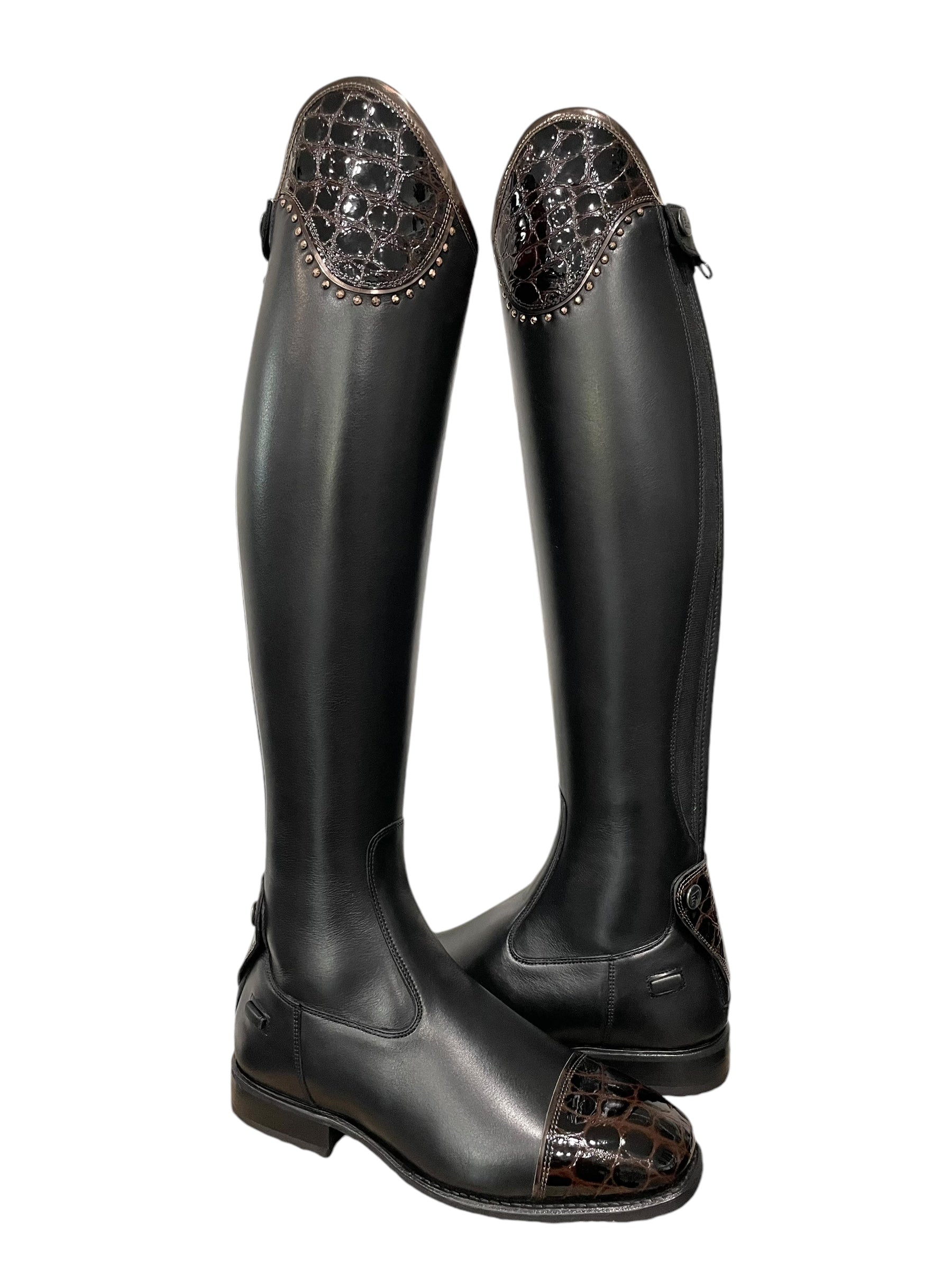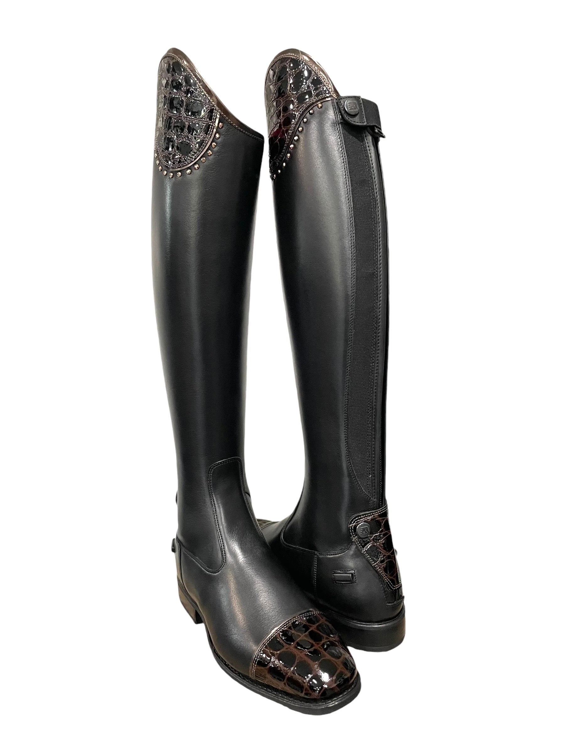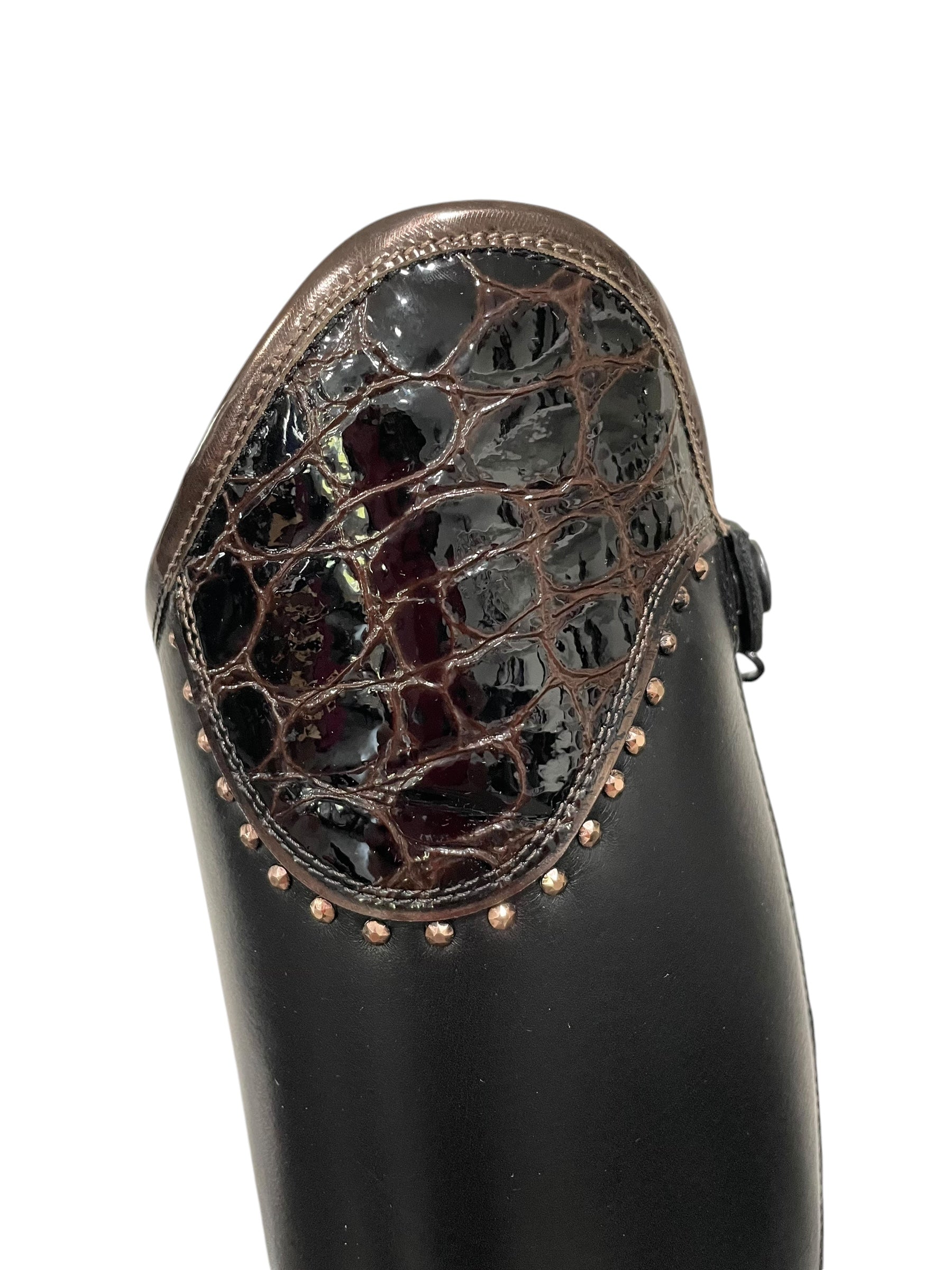 Description: WRAT black base and spur rests, salento top in lucidi moka with specchio bronzo piping and rose gold Swarovski crystals, lucidi moka toecap with specchio bronzo piping, bottom zip protector in lucidi moka, black elastic, no logo, and black outsole.