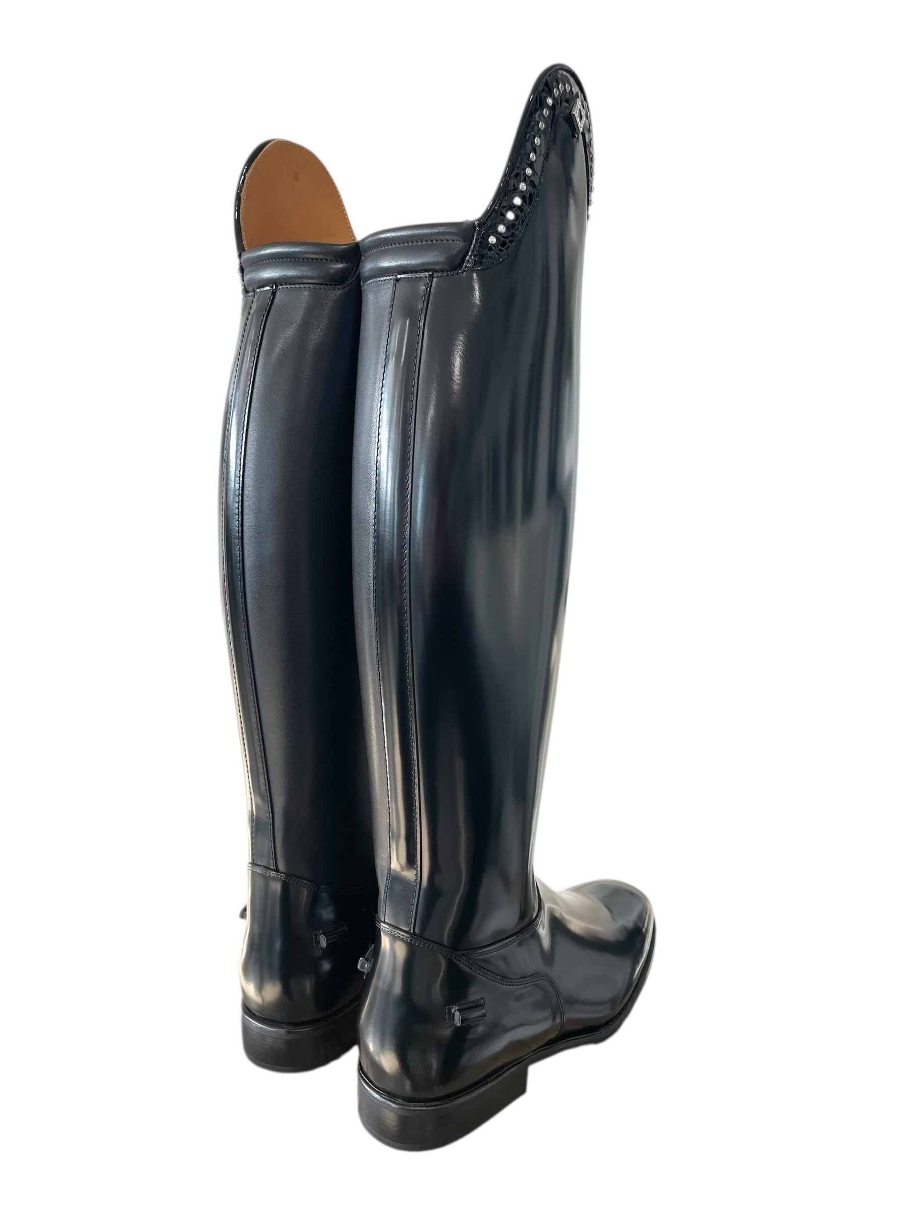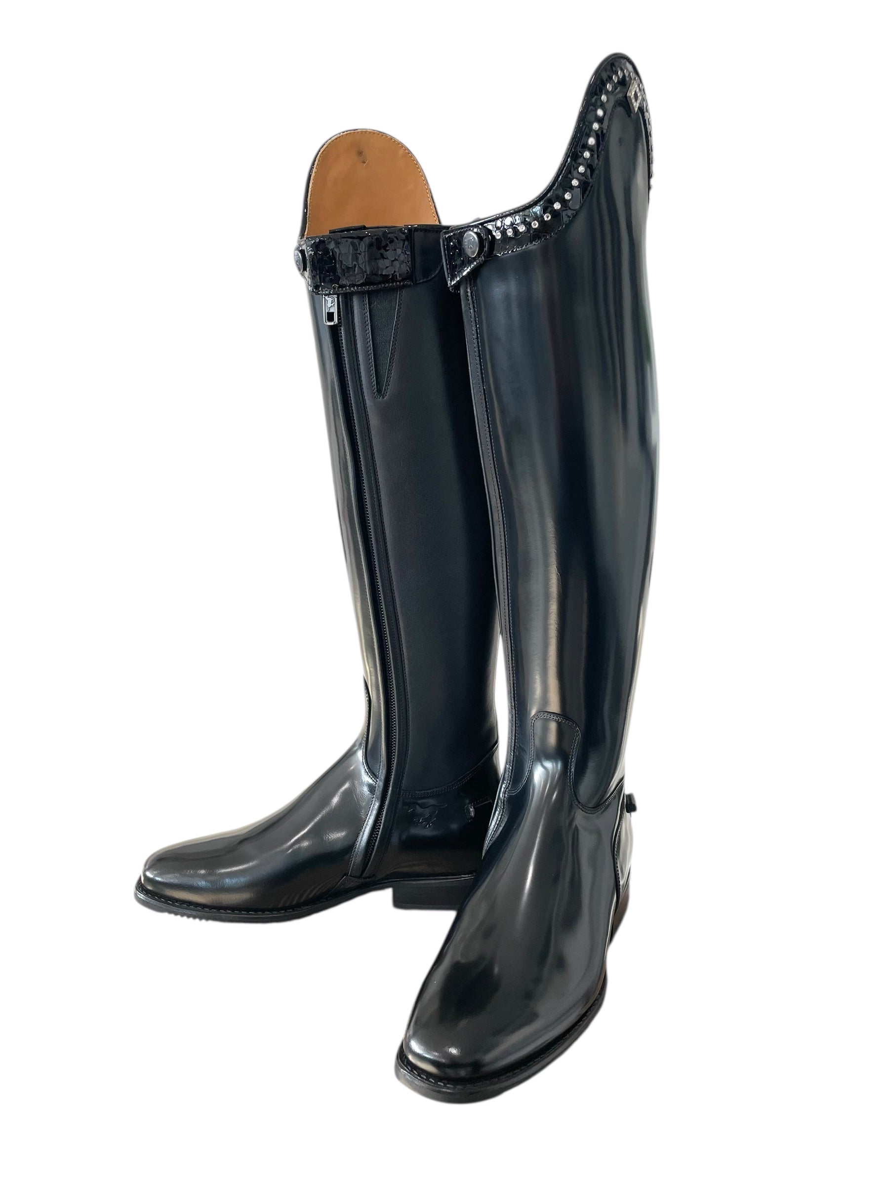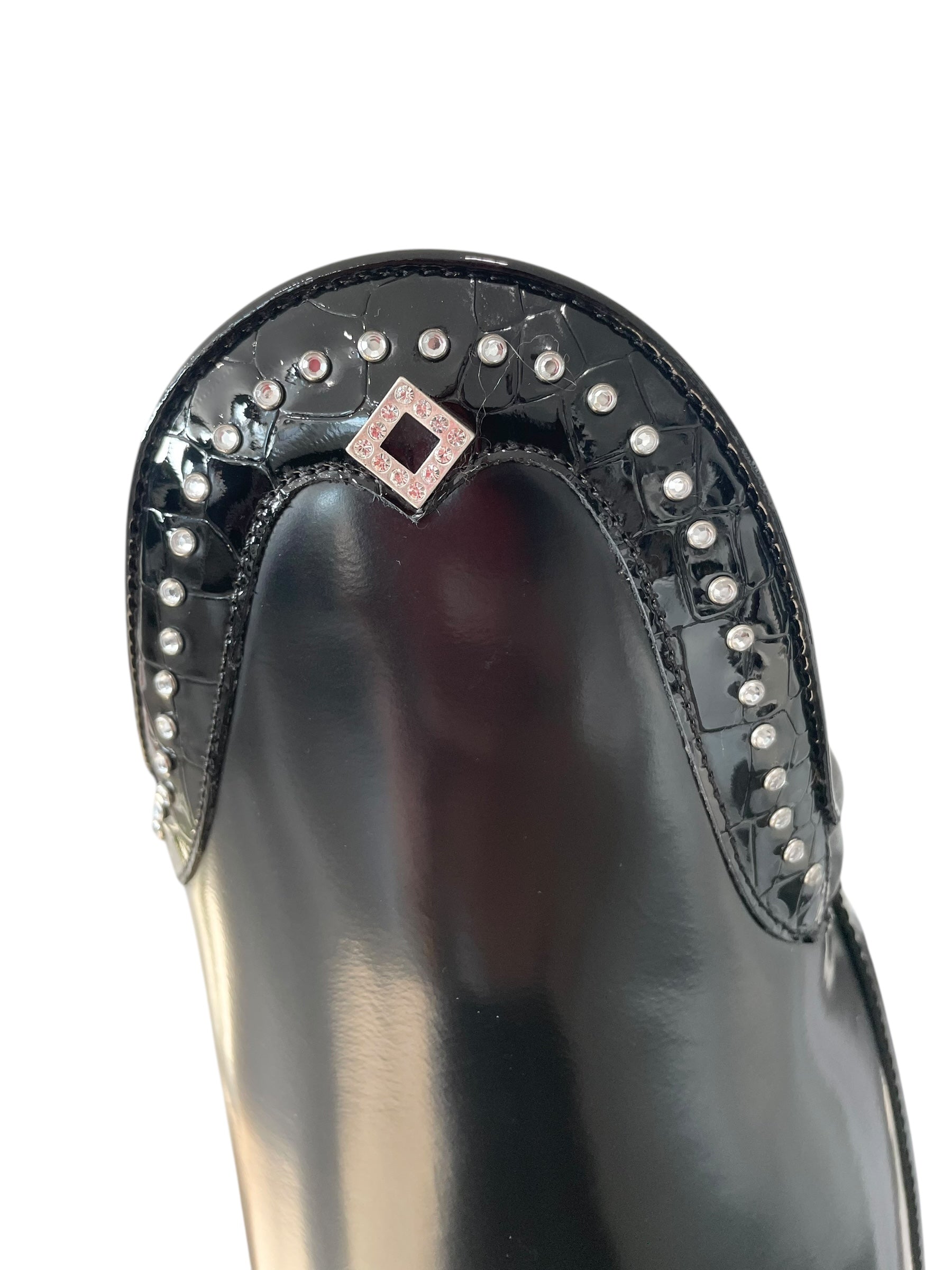 Description: Brushed black base, G9 Rondine top in patent cocco nero with GGS79 RSWB clear Swarovski 3.6 mm crystals, zip protectors in patent cocco nero, WRAT black inside shaft, Q12 V-gusset on the inside, Q13 comfort knee, square black GV logo, and black sole.