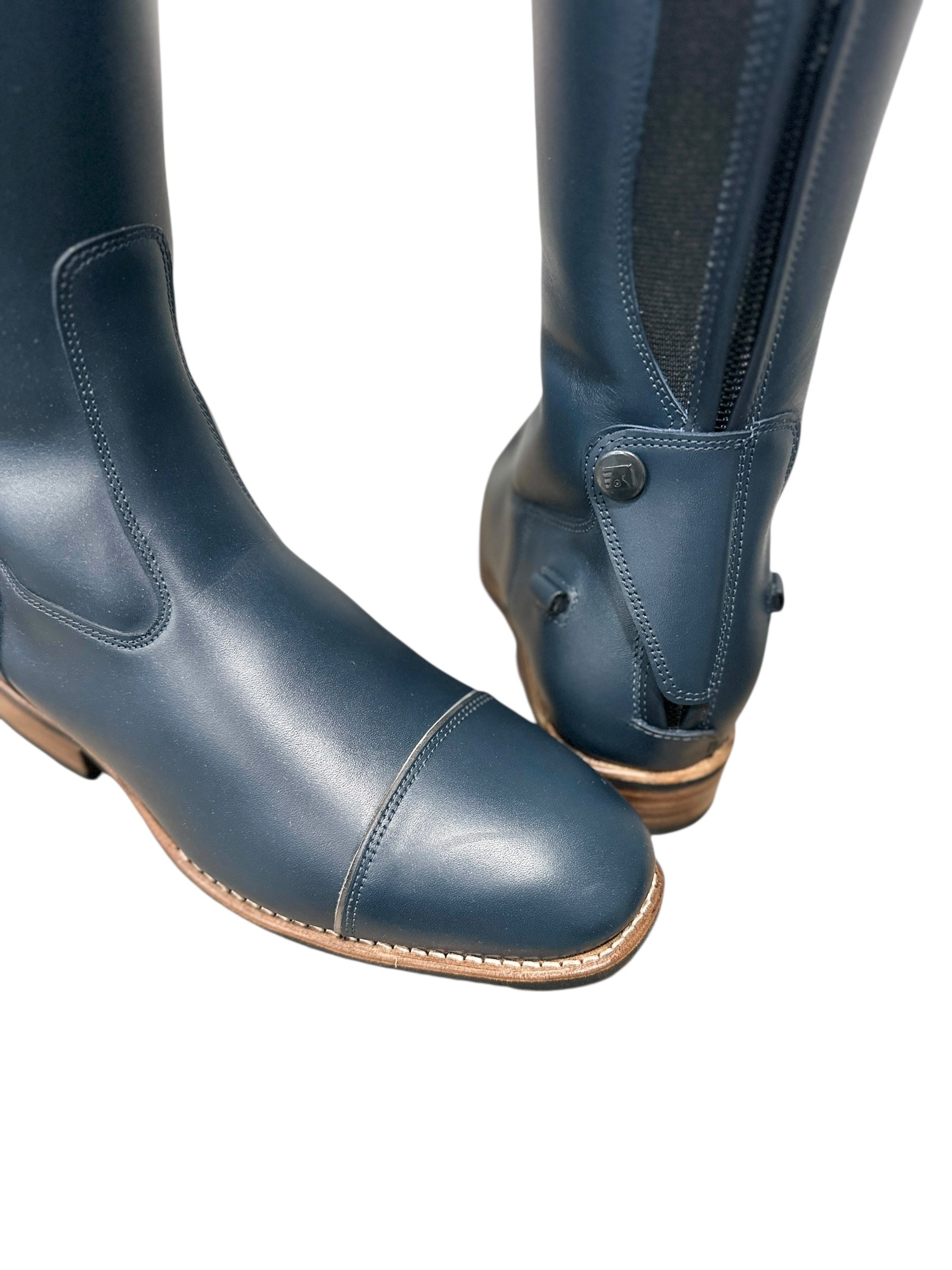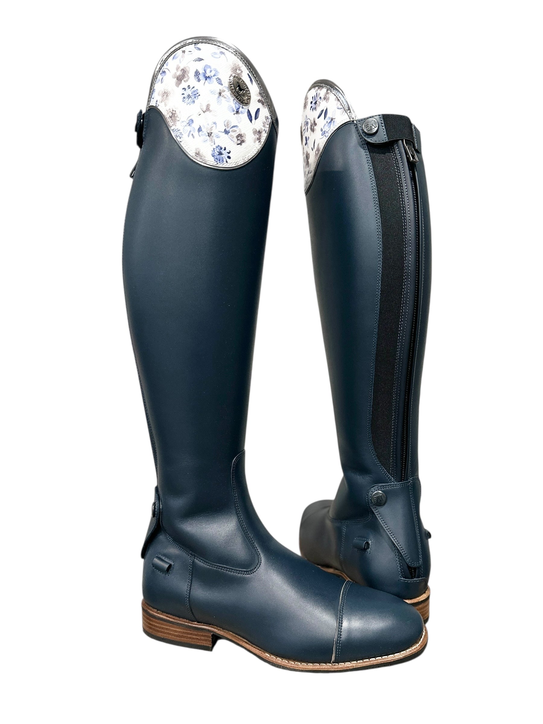 Description: WRAT blue oceano base, Salento top in flower blue with specchio iron top piping, toecap with specchio iron piping, Q14 lambskin lining inside the boot, silver logo, and brown sole.