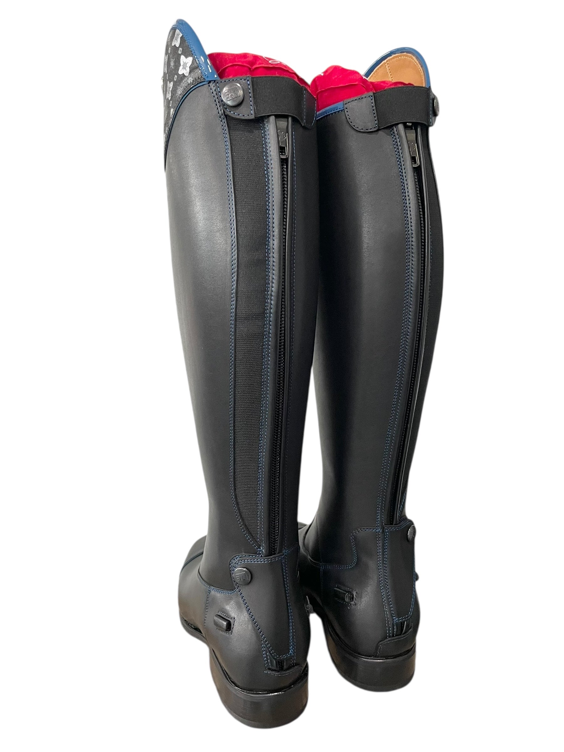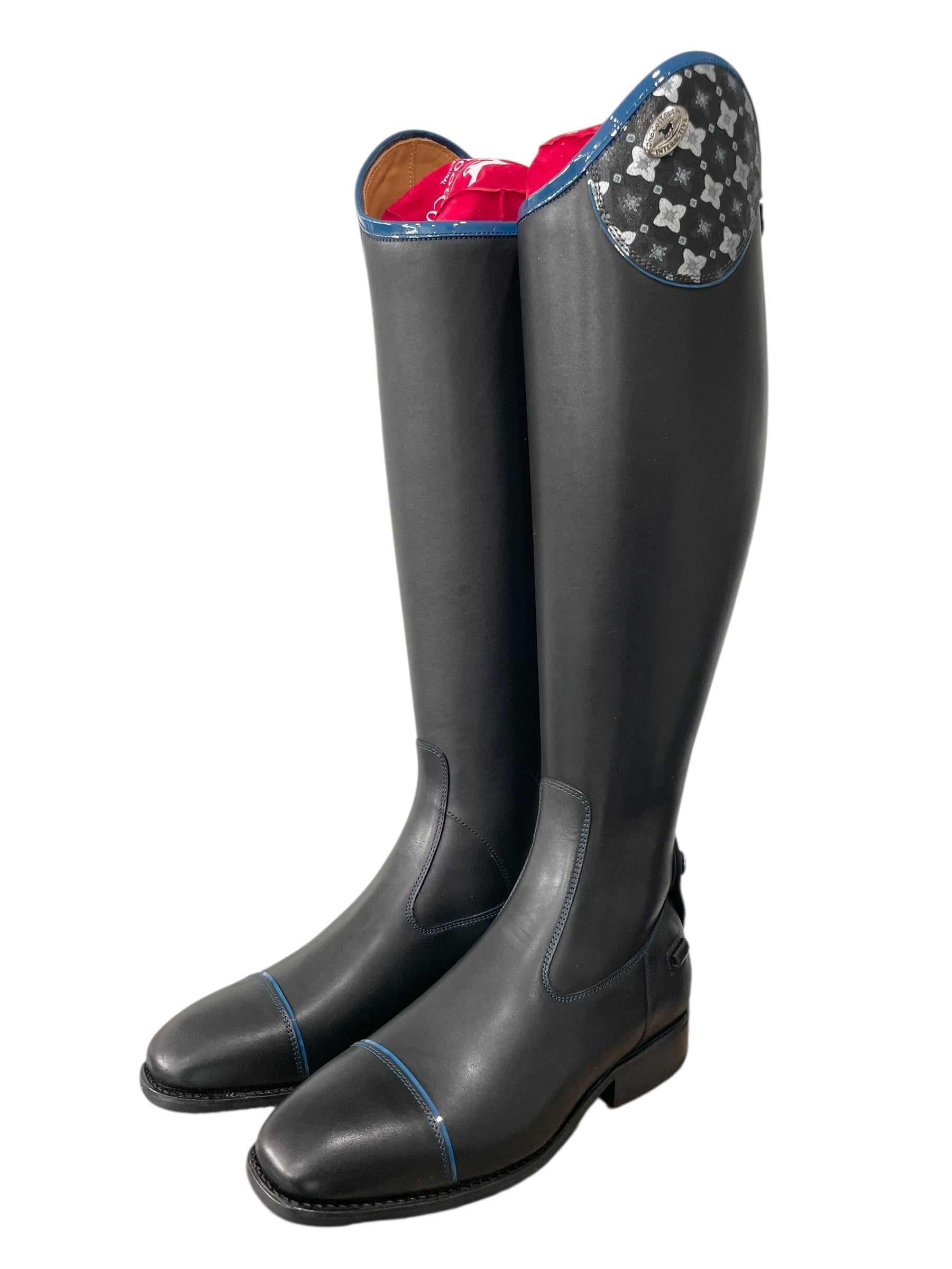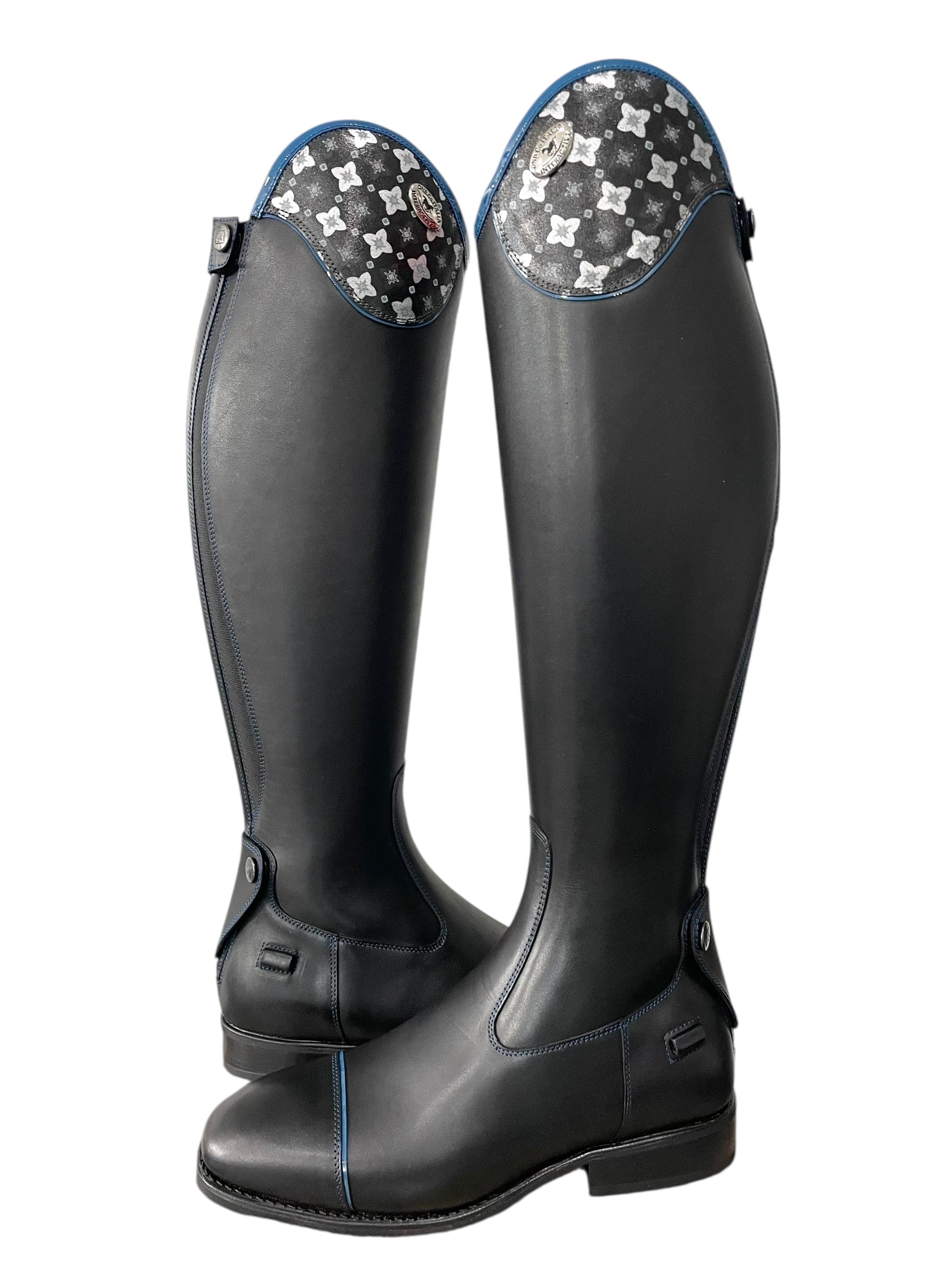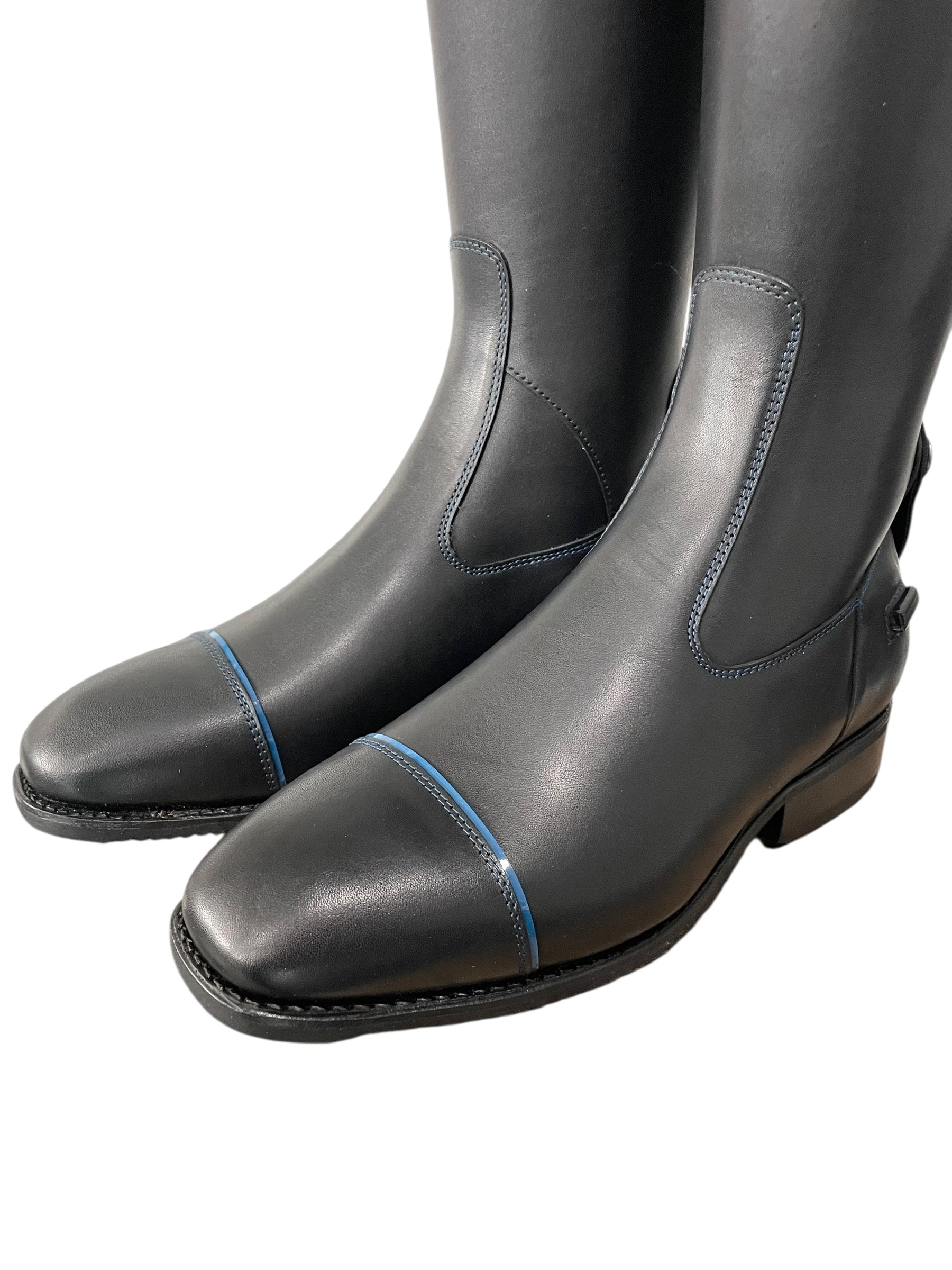 Description: WRAT black base, Salento top in fortuna black with patent electric blue piping, E4 toecap with patent electric blue piping, blue stitching, black elastic, silver logo, and black outsole.