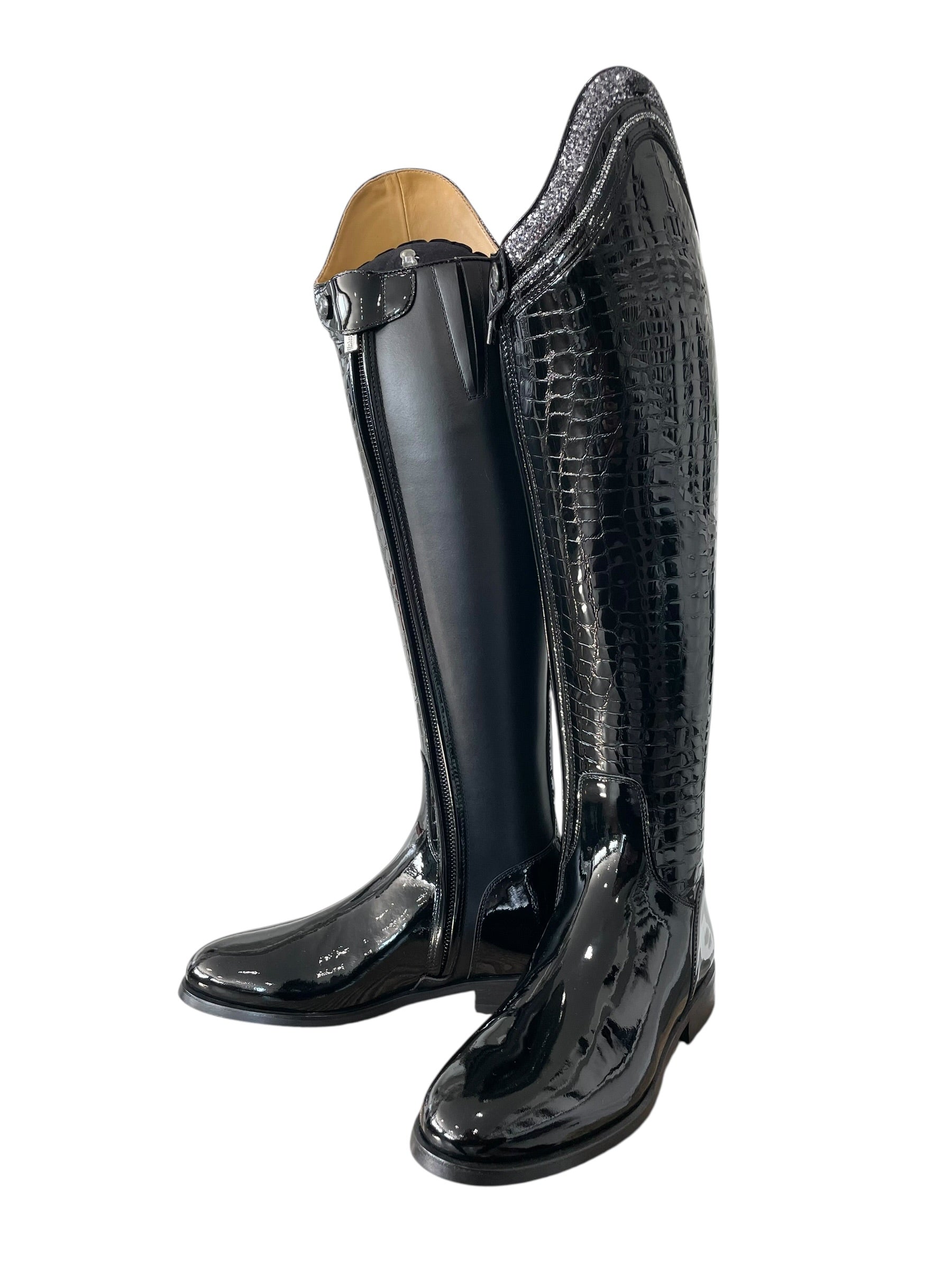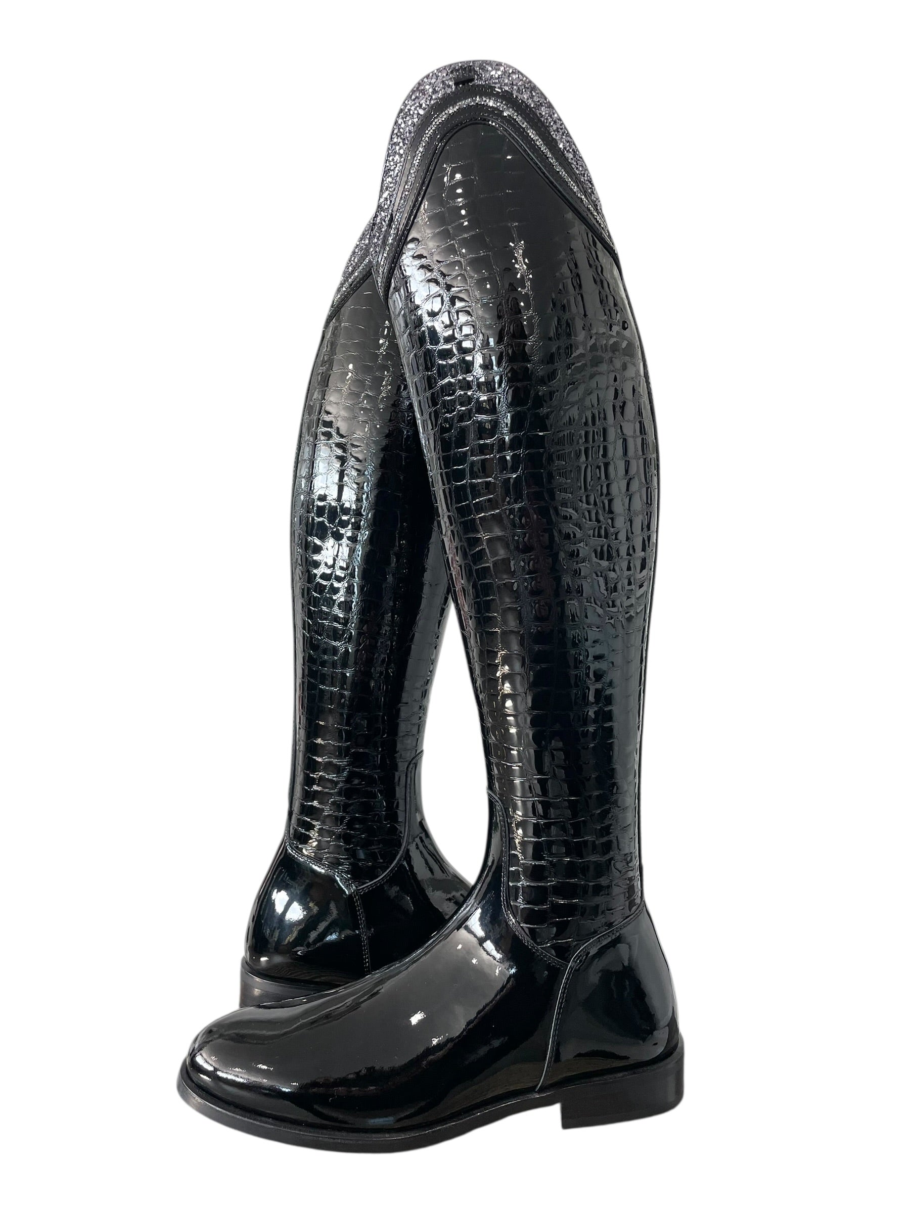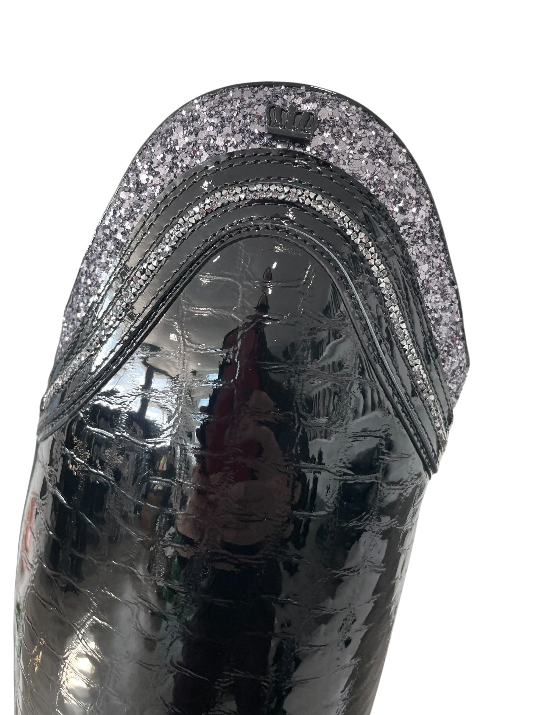 Description: Roma black base with croco bril black shaft, nature black inside shaft with V-gusset, Dulce top in grueso anthracite with black polished Swarovski rocks banding, matte black logo crown, and black sole.