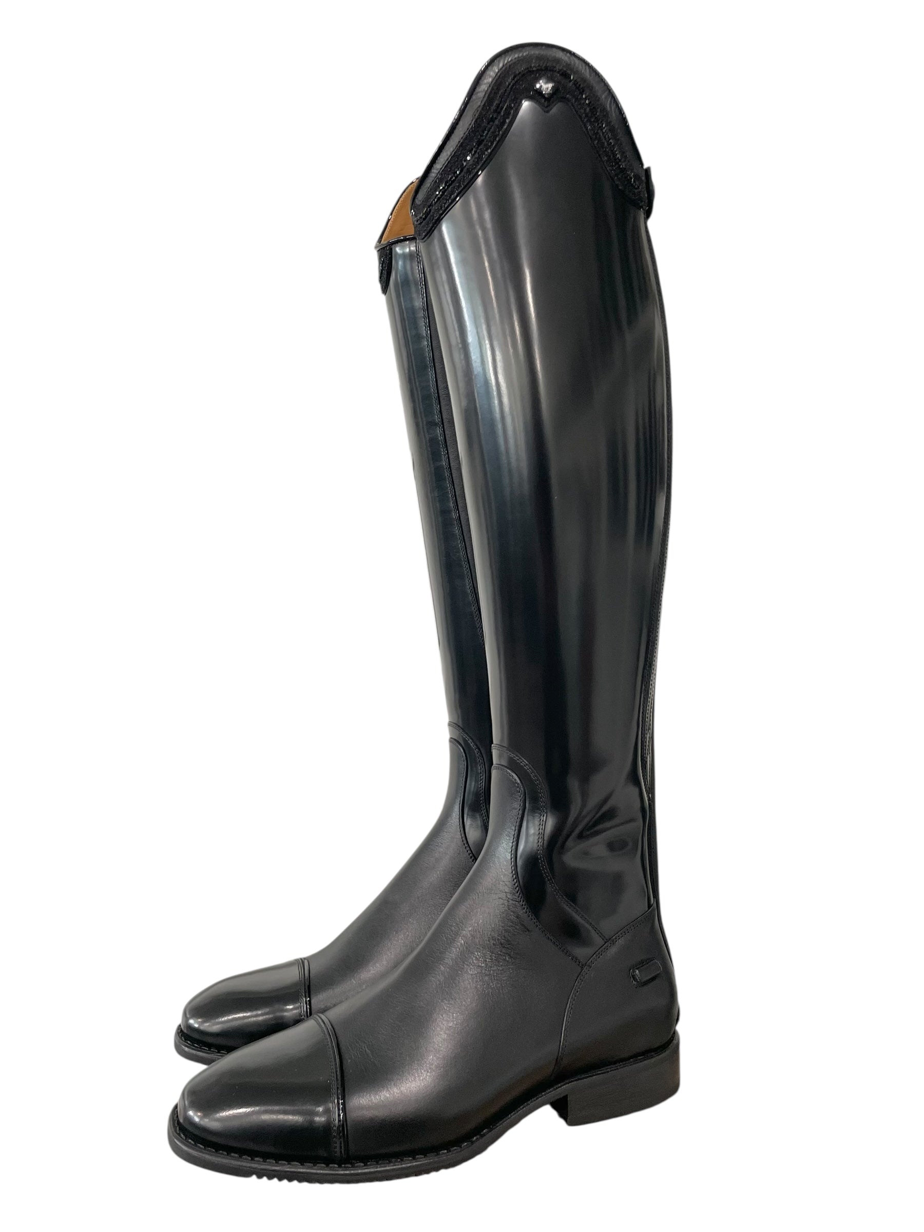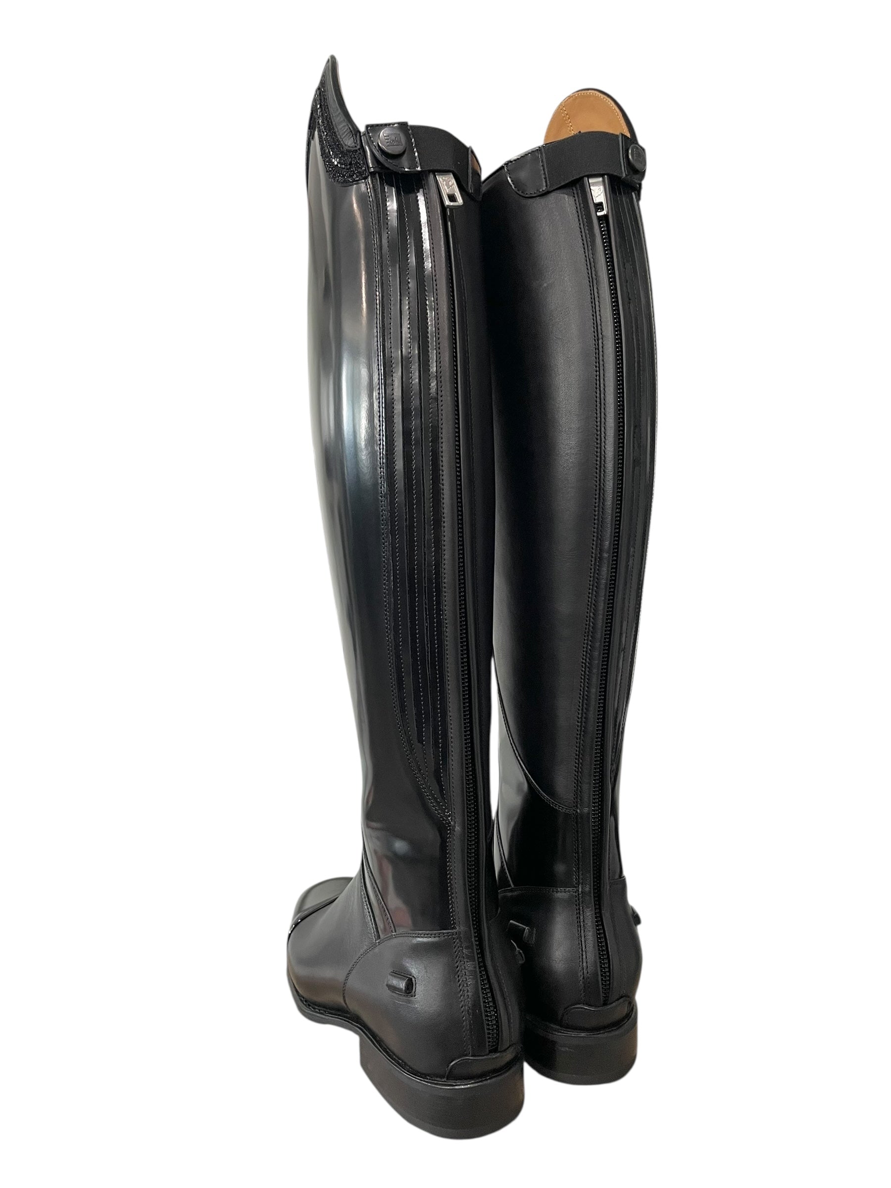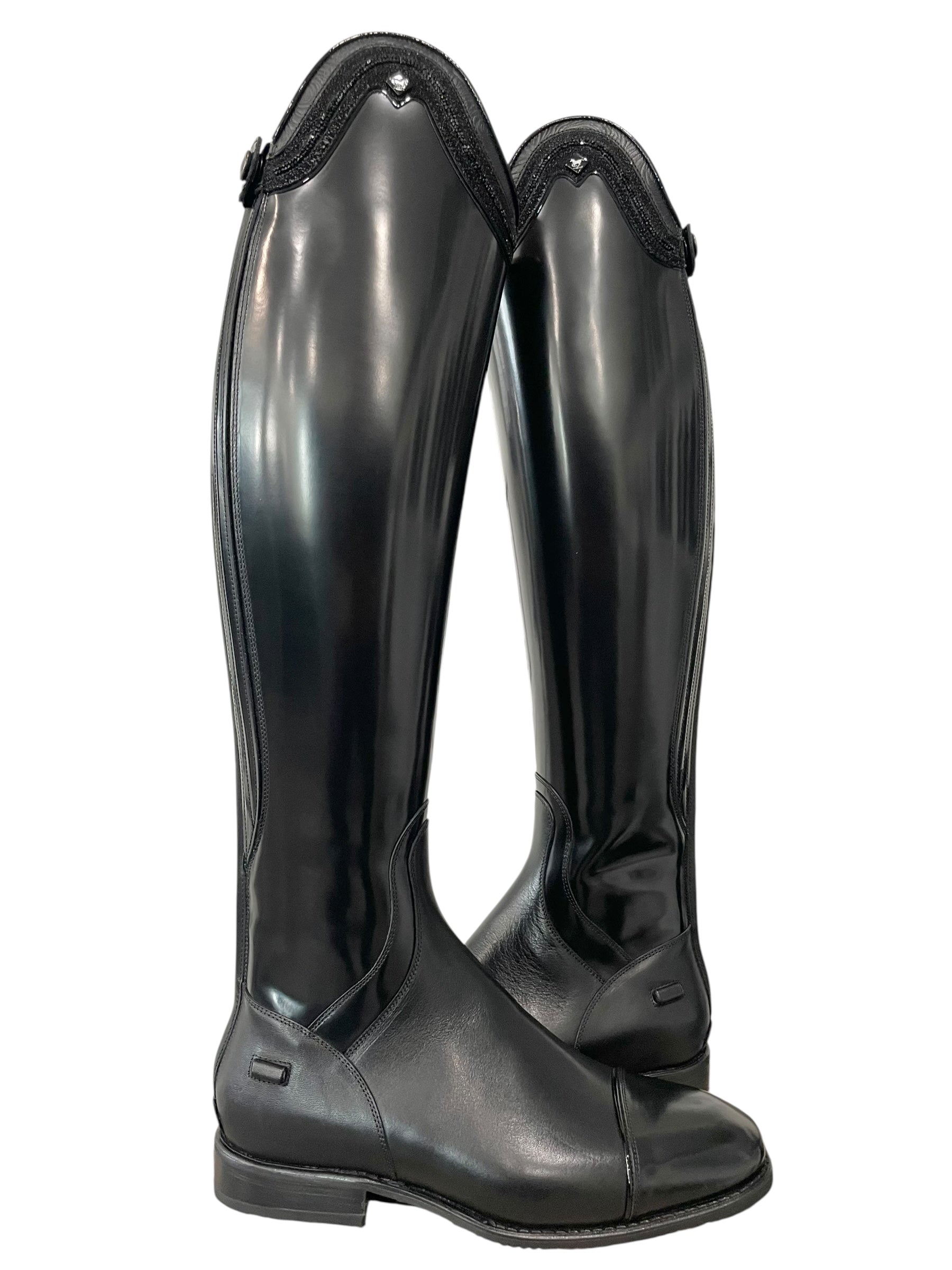 Description: Brushed black leg and toecap, brushed black frame around instep, WRAT black instep and heel, spur rests, Q11 inner patch in WRAT black, black elastic along the zipper covered in WRAT black, matte black logo, top in rosetto black with stardust black and channel of SW cry fine black Swarovski stones, top and toecap piping in patent black, and black outsole.