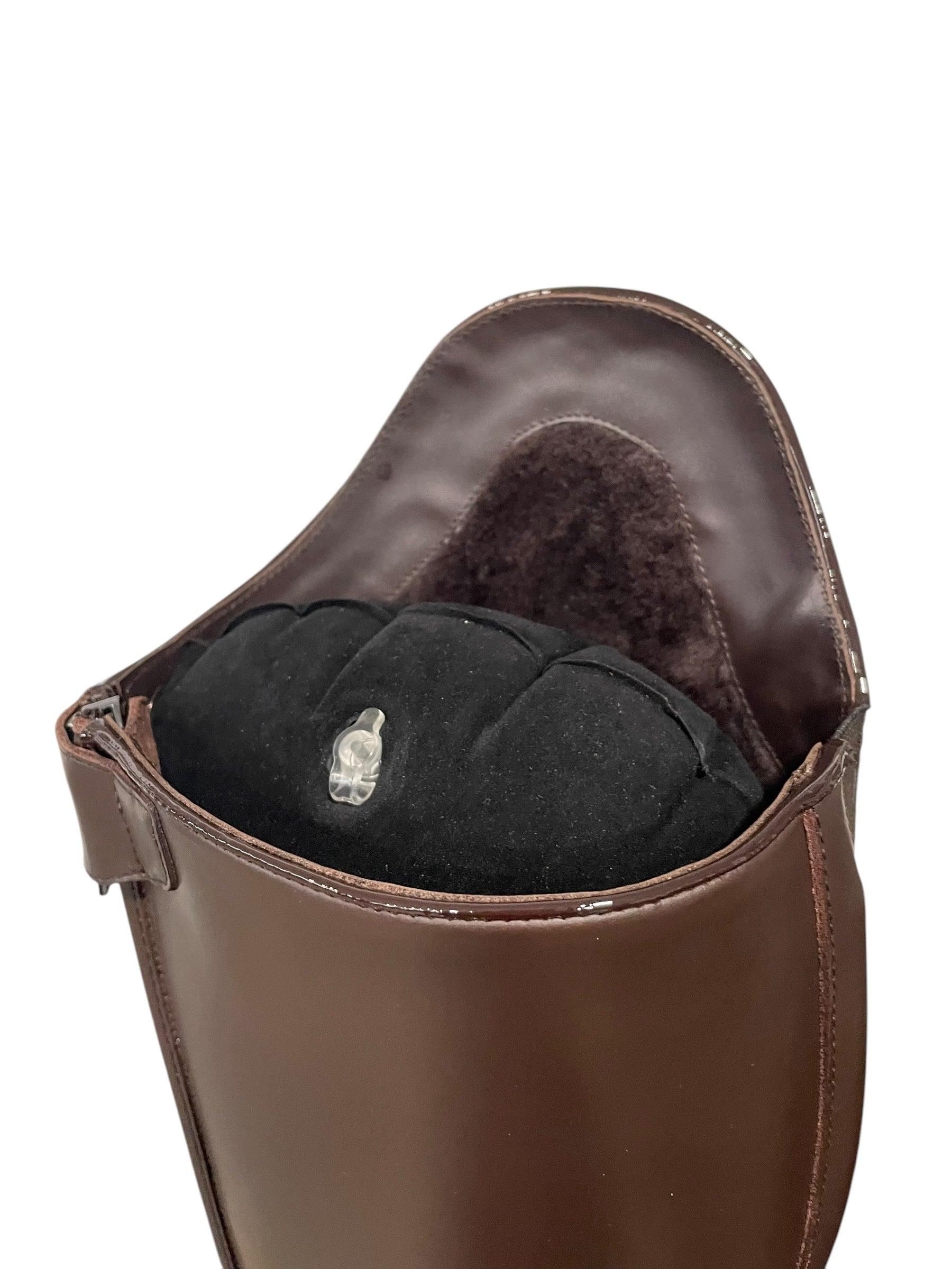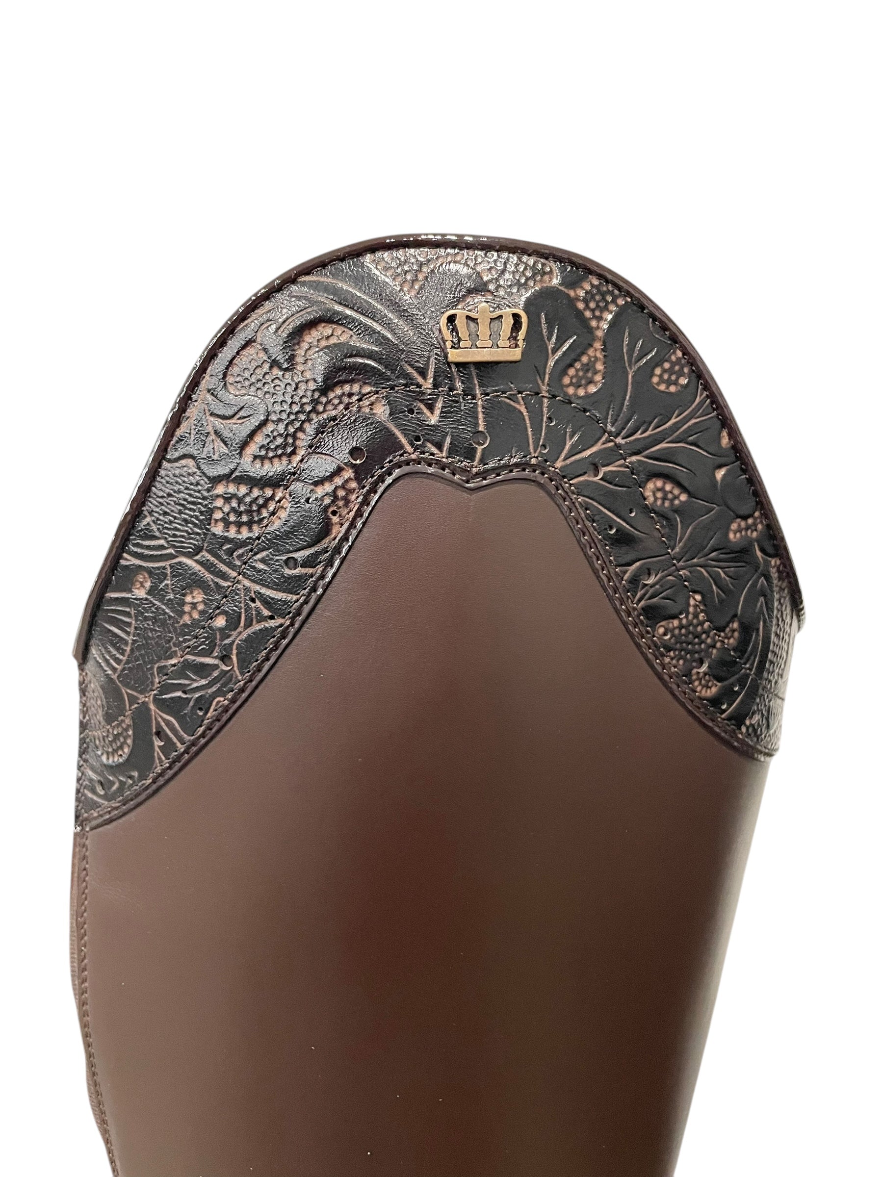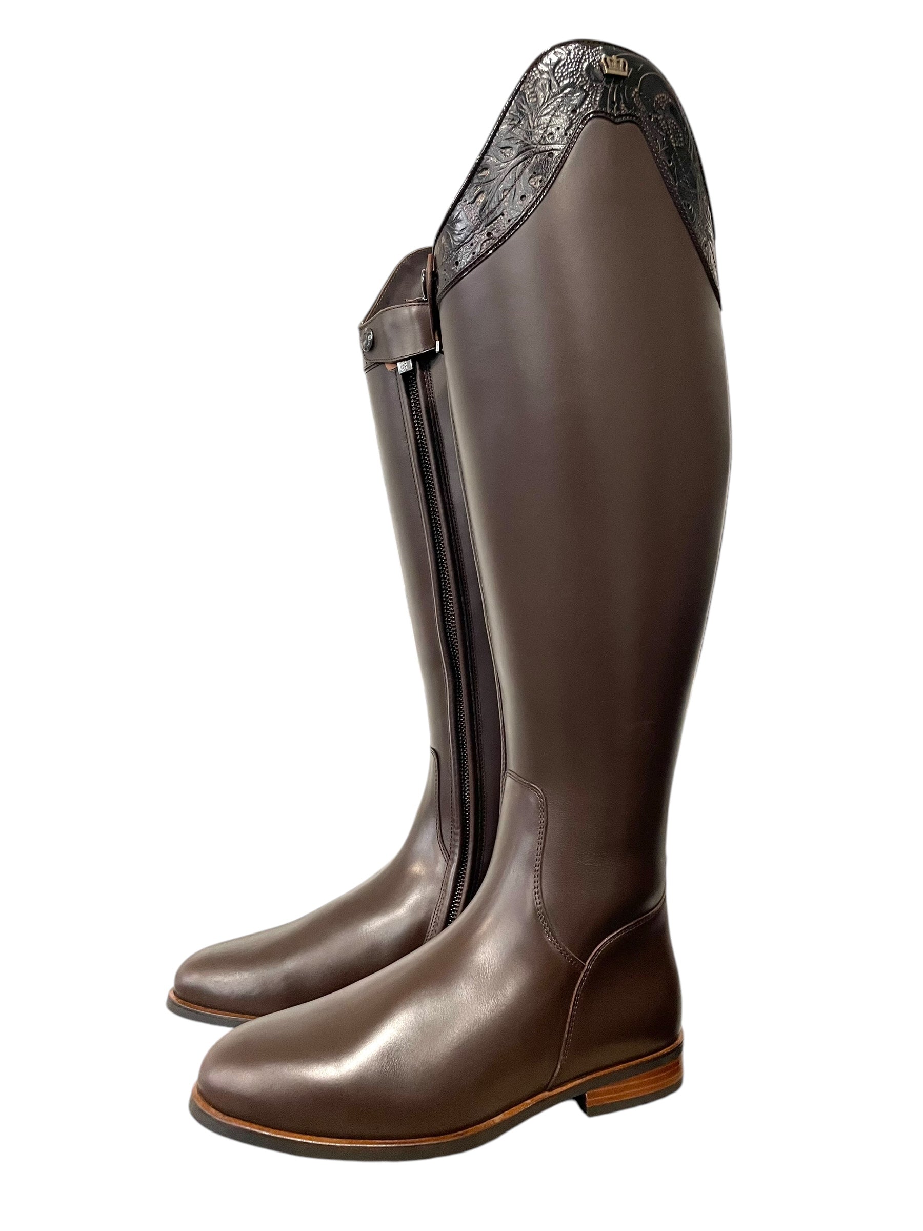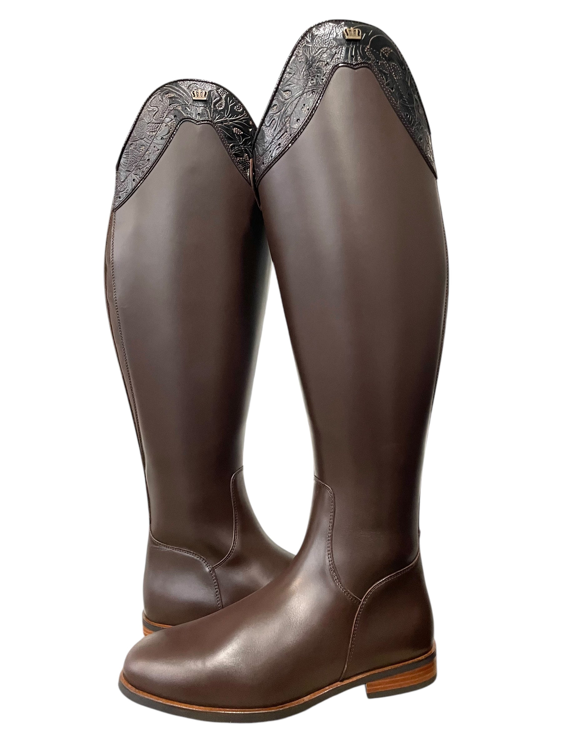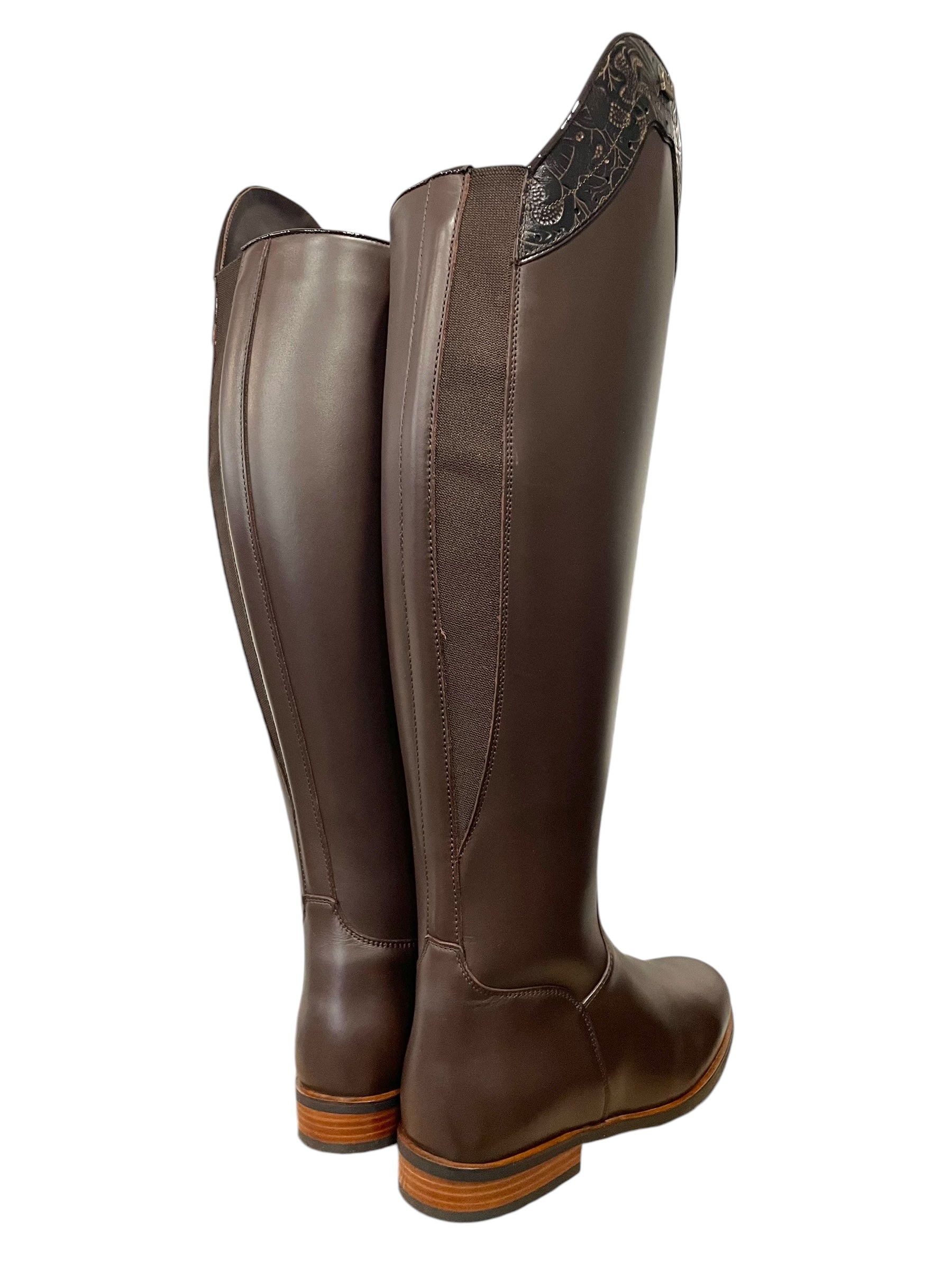 Description: Nature brown base, brown elastic along the back, chocolate brown sheepskin lining inside, Ziva top in oak dark brown with roma castanho piping, old gold logo crown, and brown outsole.
