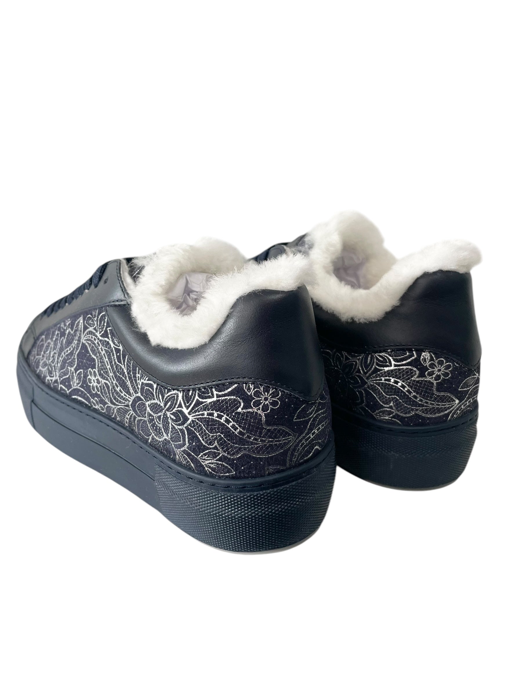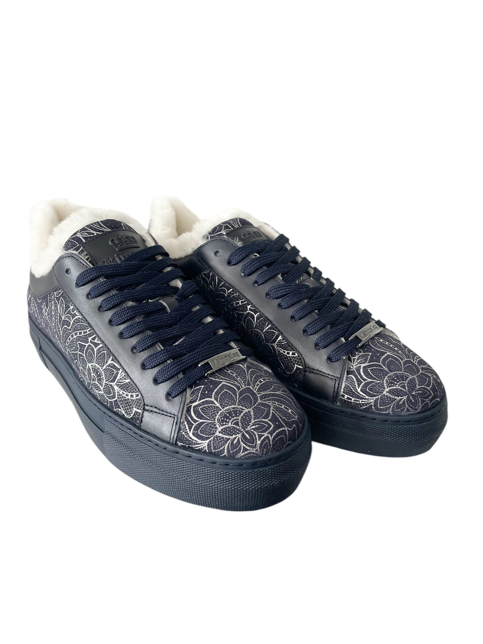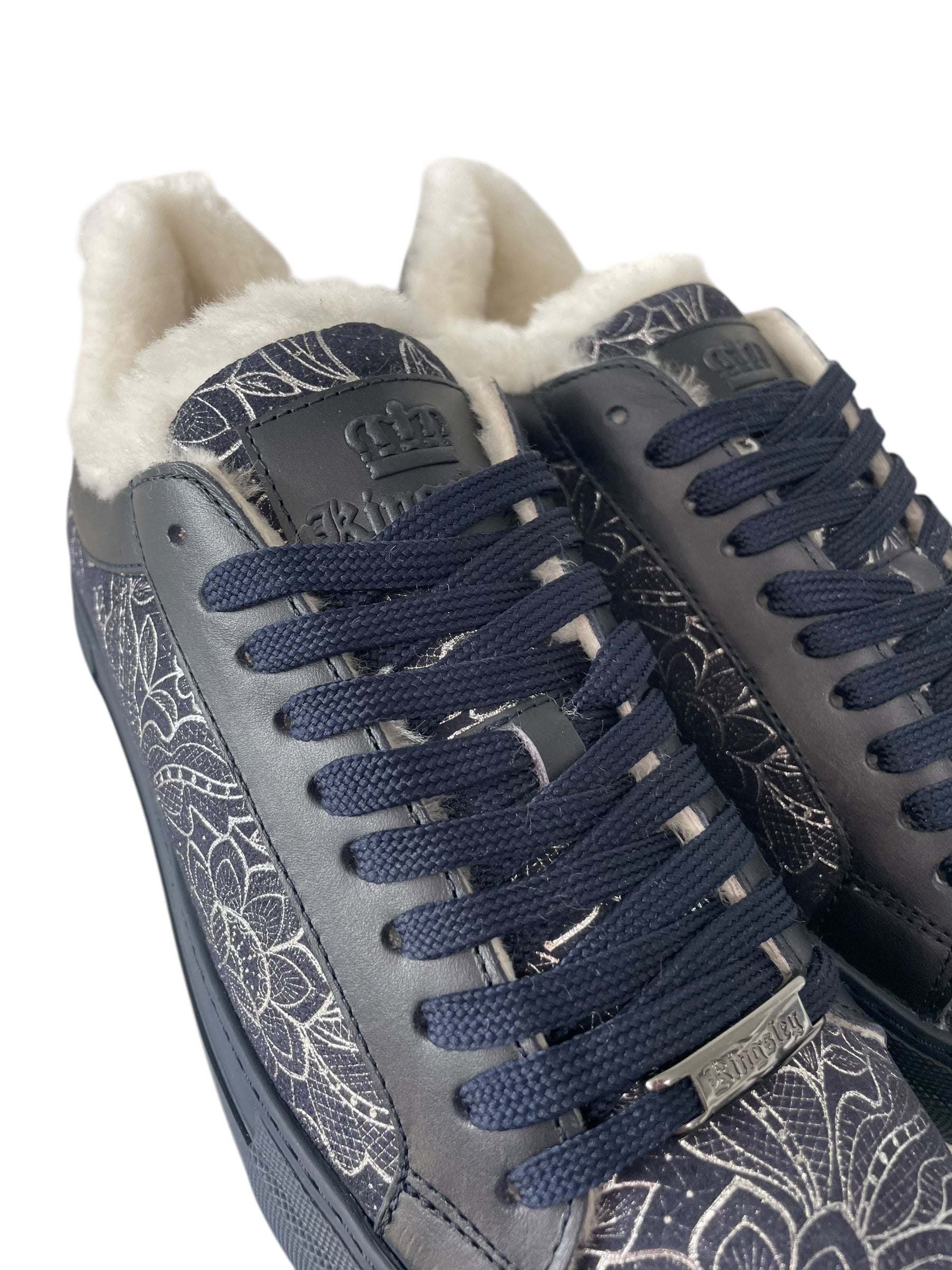 Description: Silver flower blue base and toecap, nature blue logo patch, eye stay, and collar, blue pilota laces, polished black application, white sheepskin, and navy outsole.