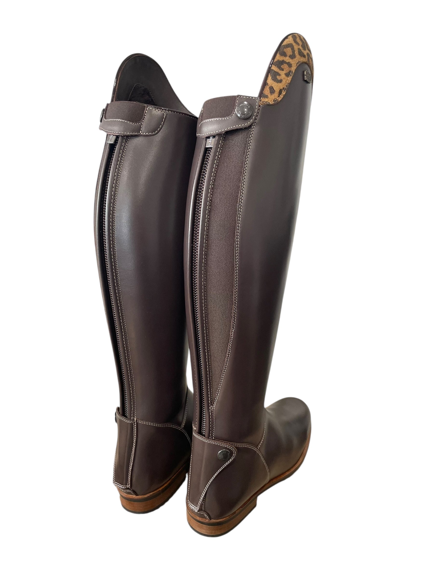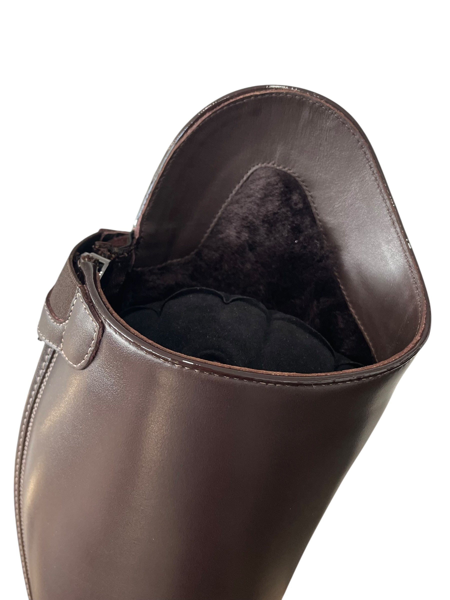 Description: Aspen dark brown base, brown elastic, chocolate brown sheepskin lining, sand beige stitching, roma castanho top piping, Libra top in jaguar, old gold logo crown, and brown outsole.