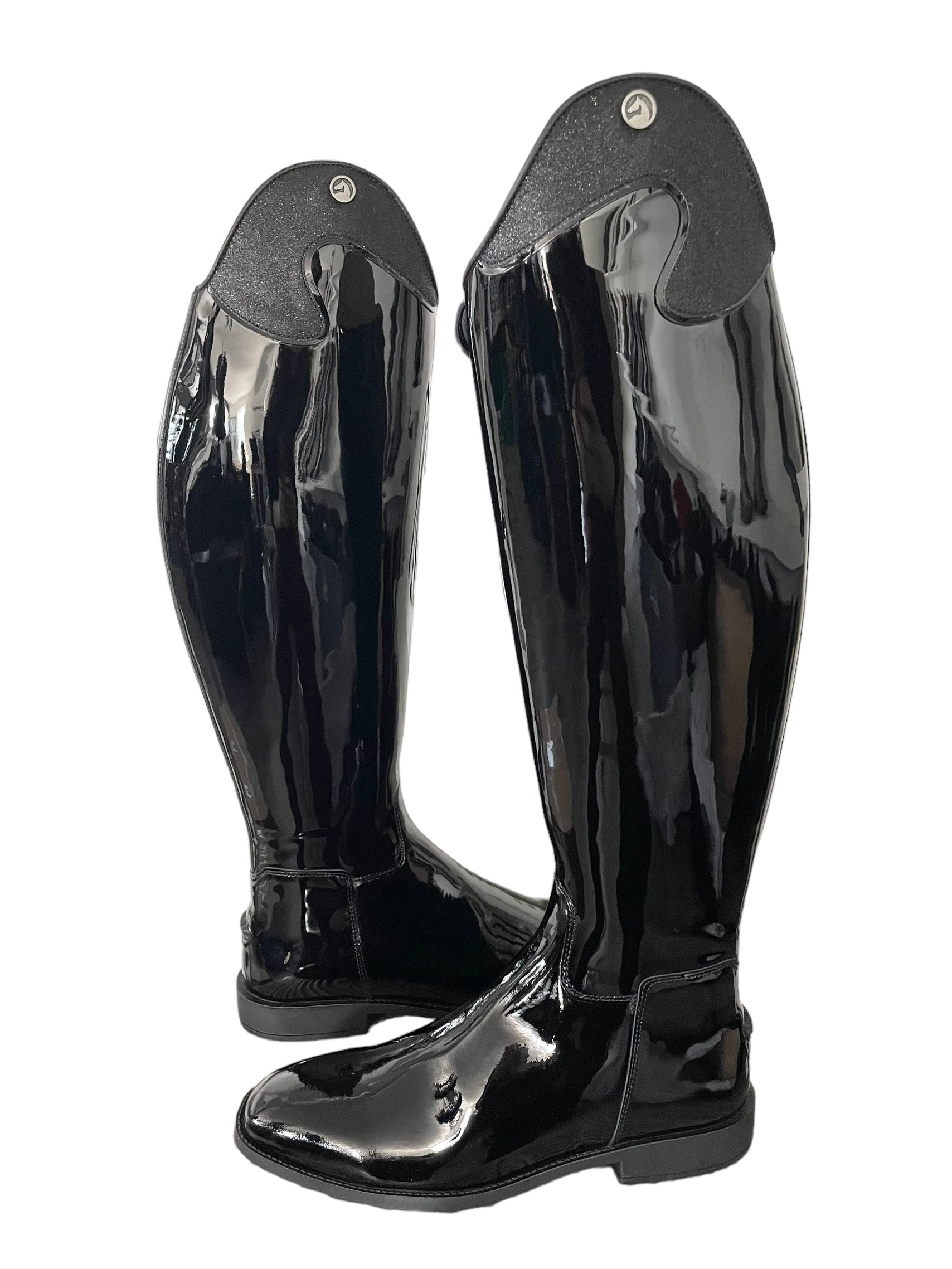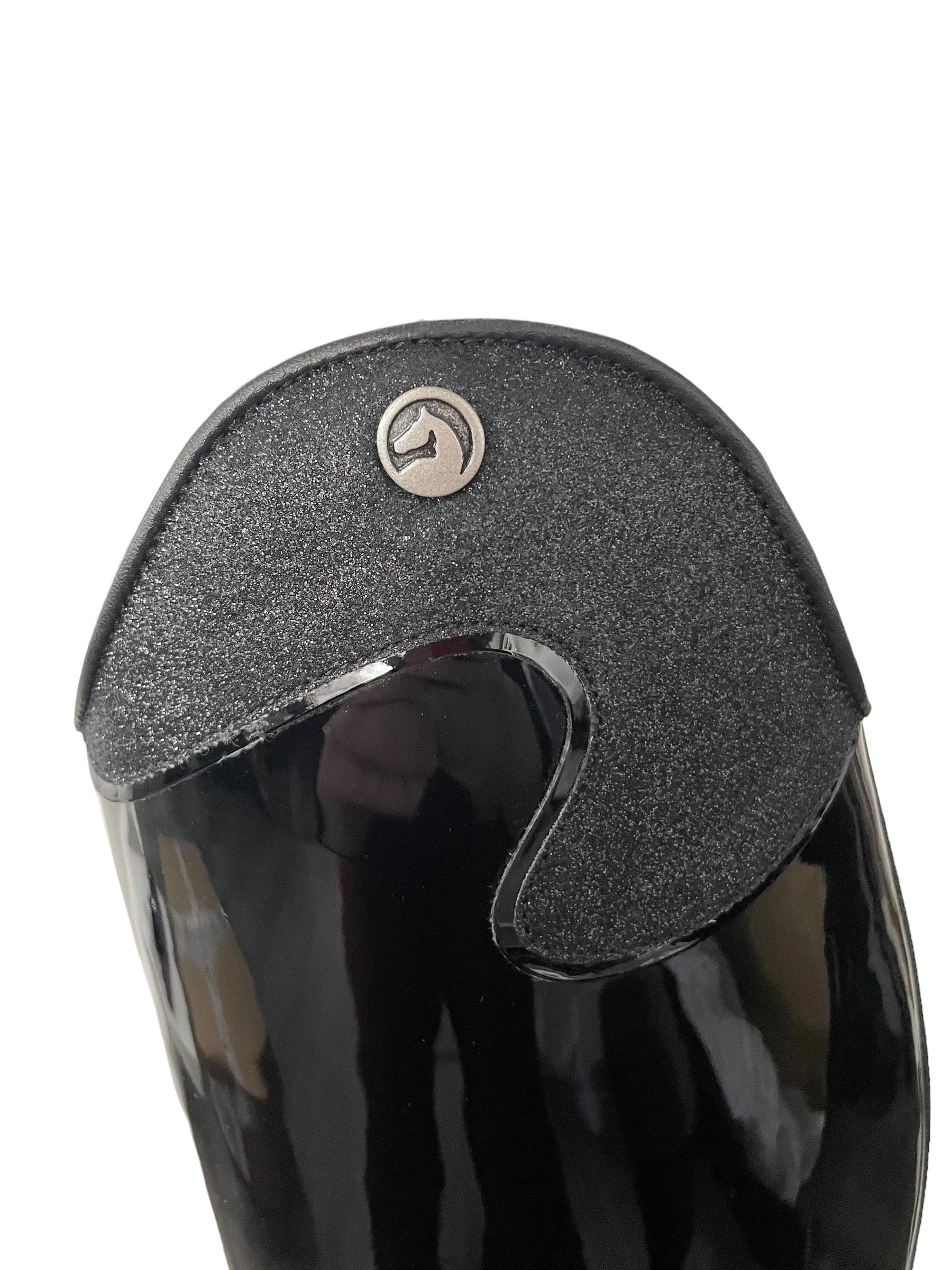 Description: Patent black base, T1 top in black glitter, S2 spur rests, and black S3 outsole.