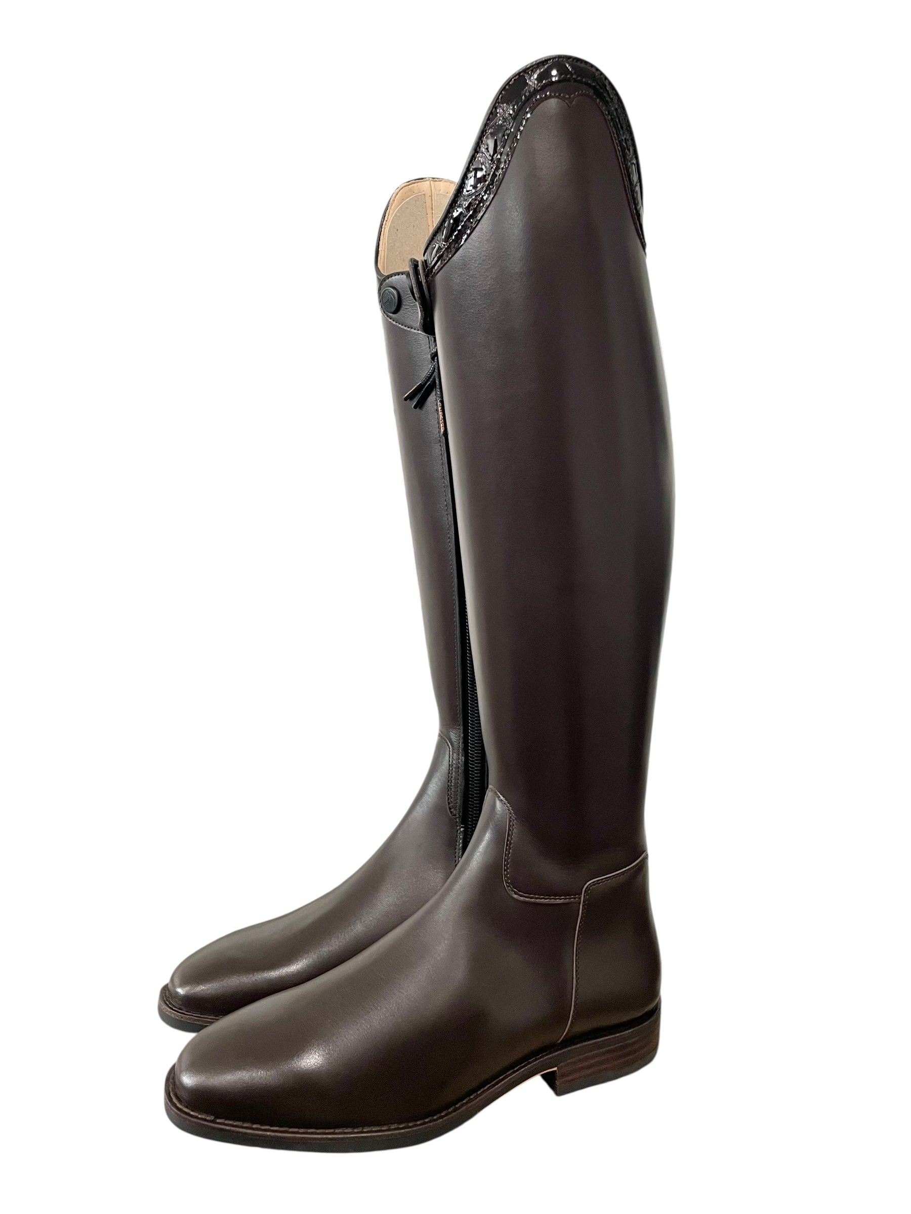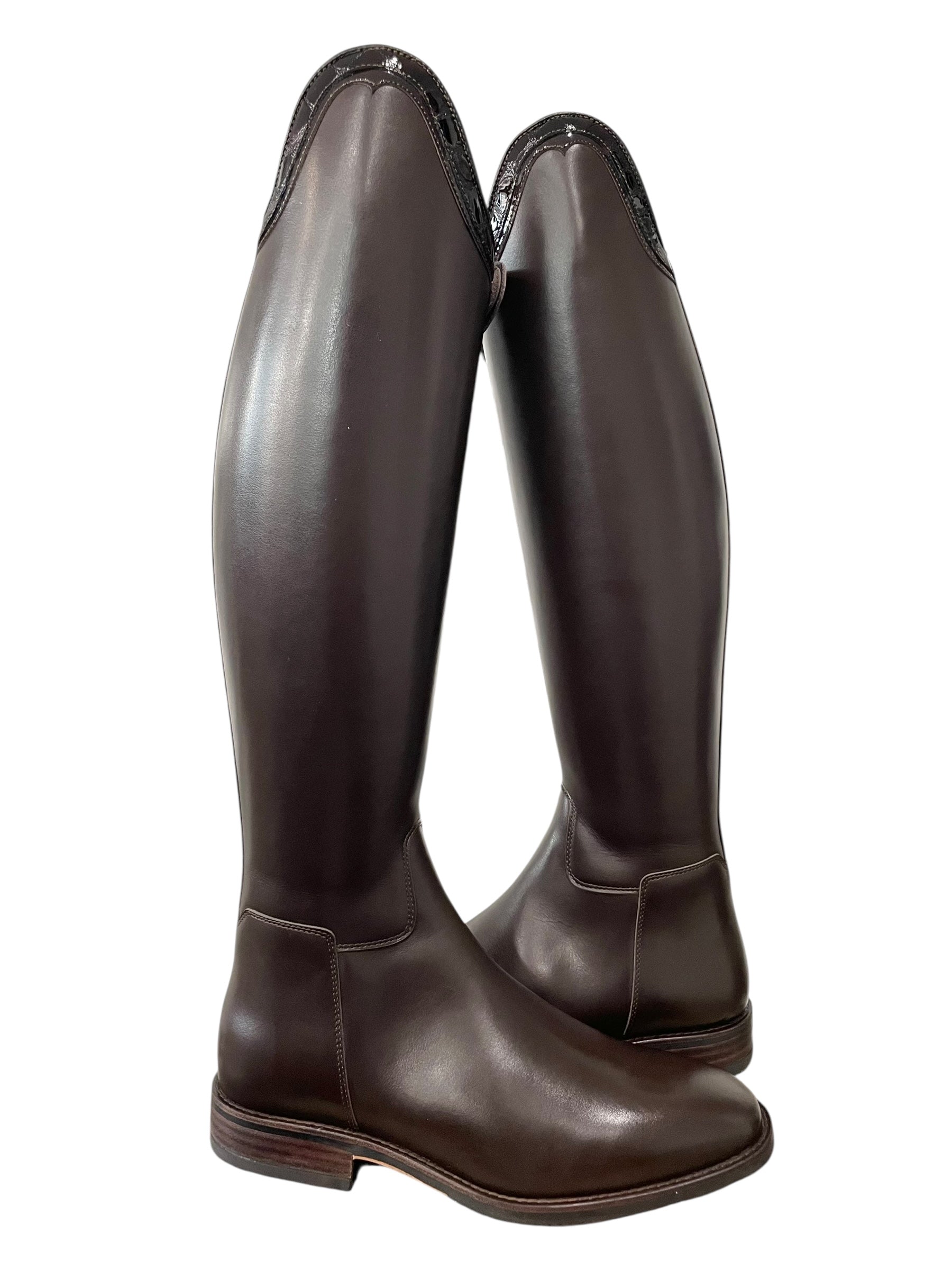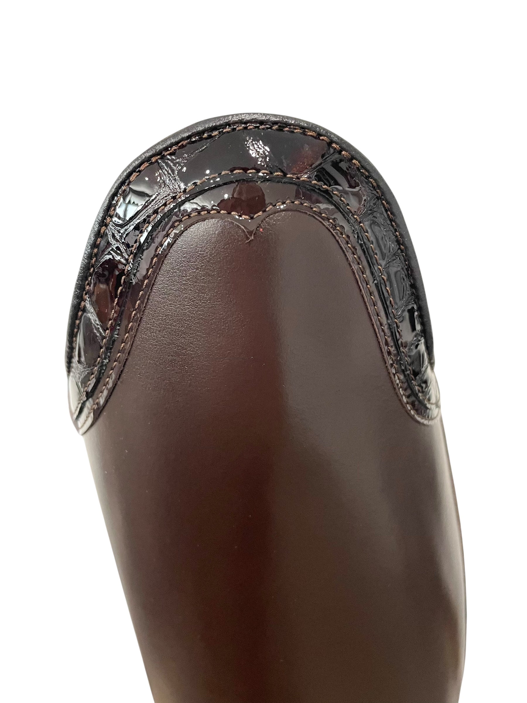 Description: P3 dark brown base, T4 top in P22 patent brown croc and P6 patent dark brown, and dark brown outsole.