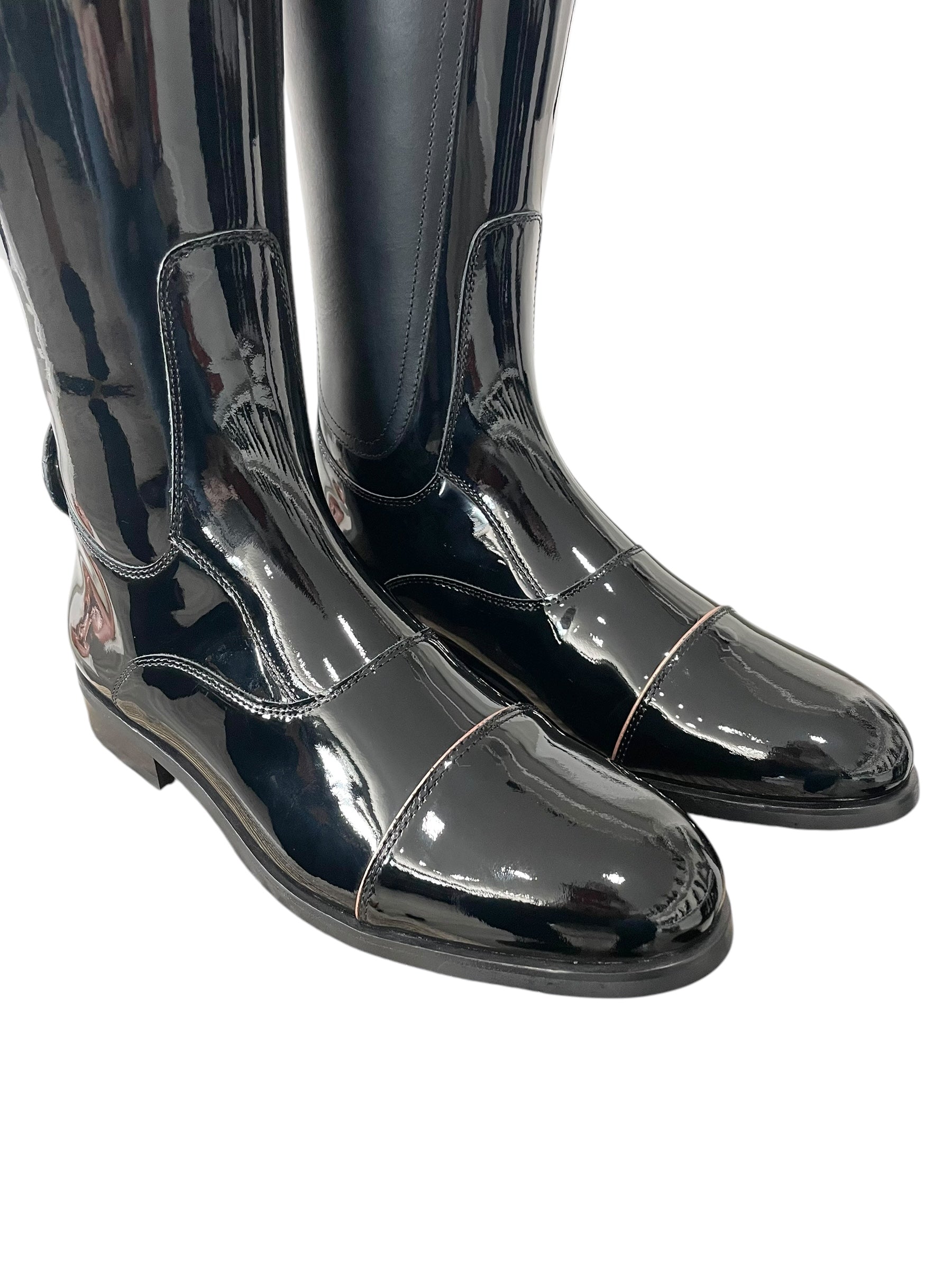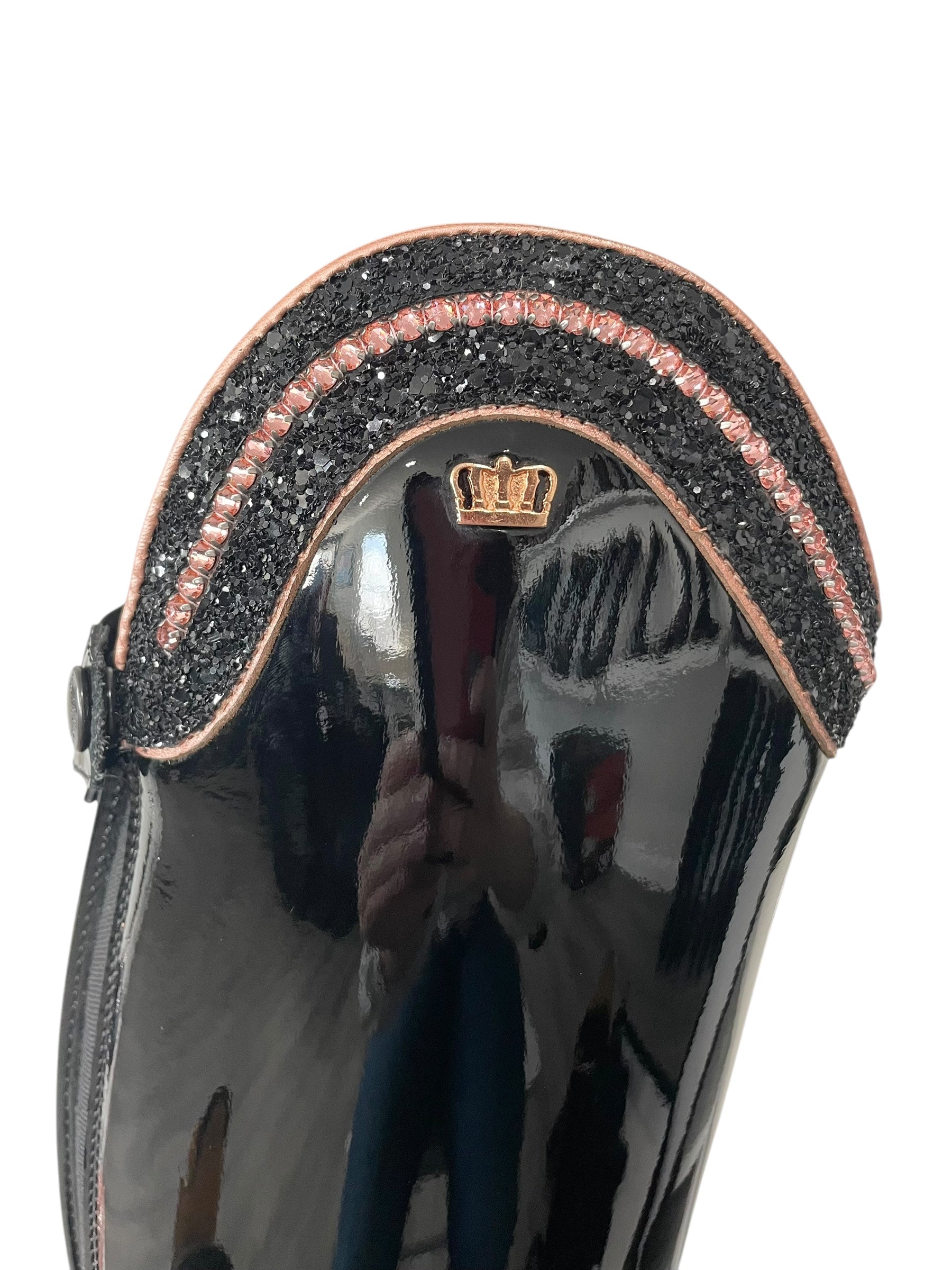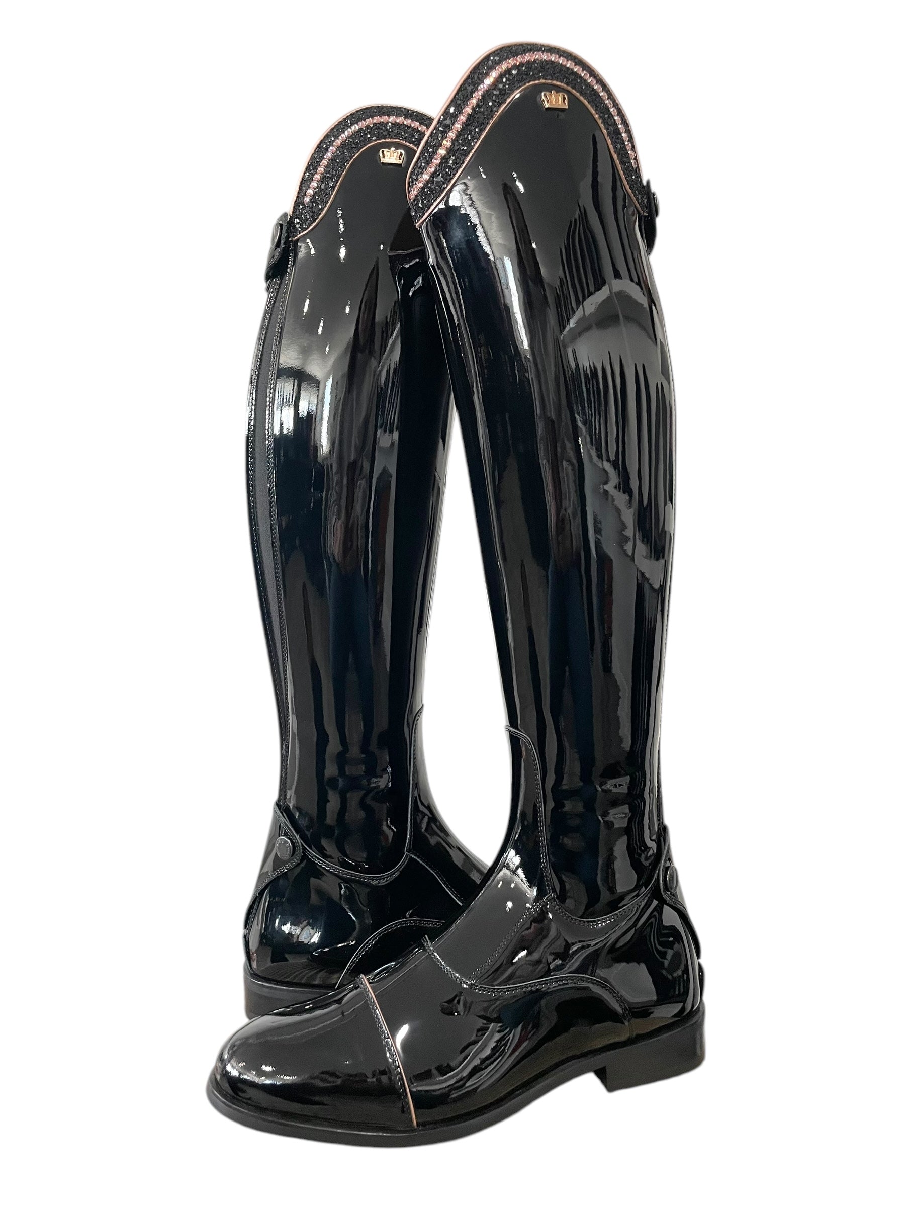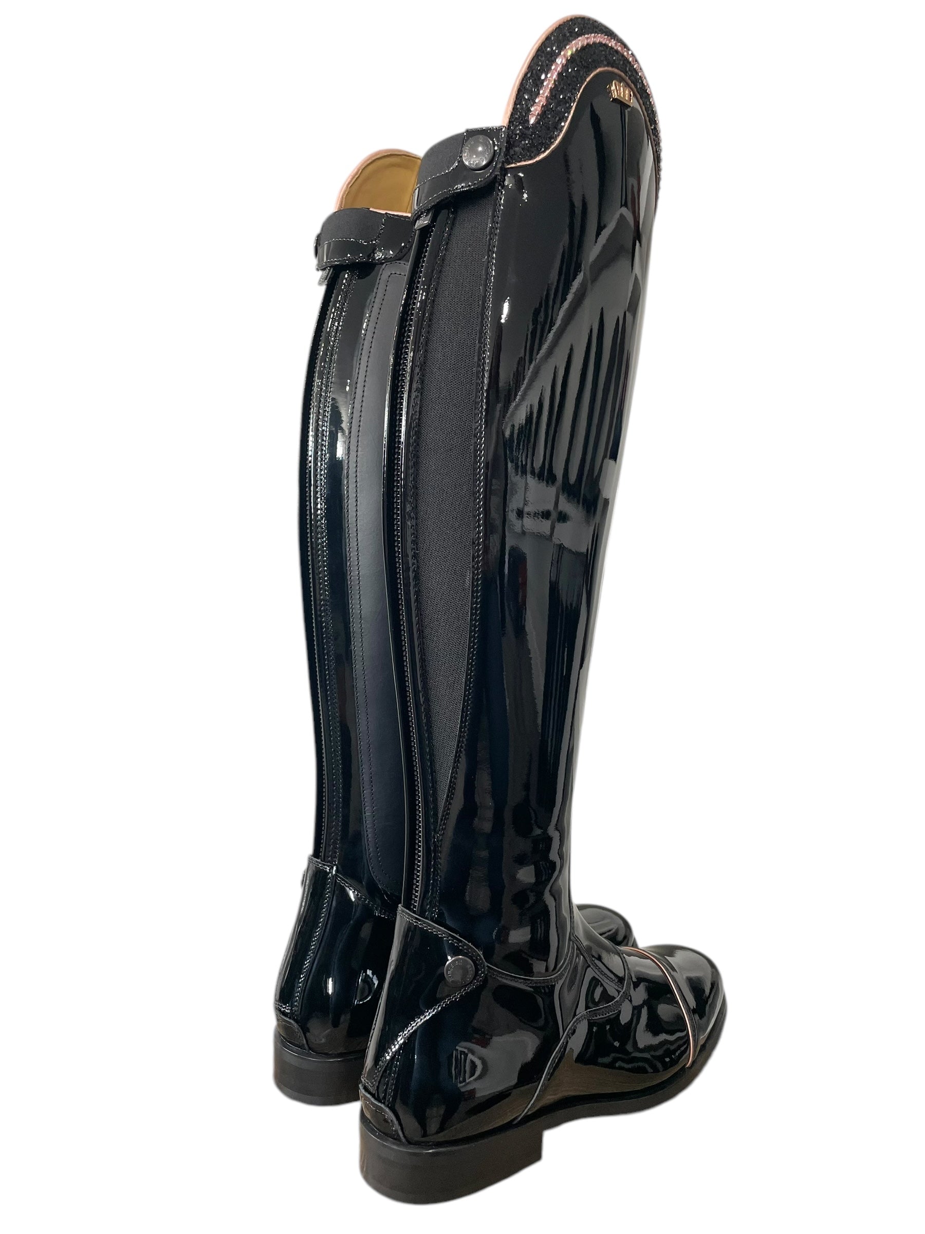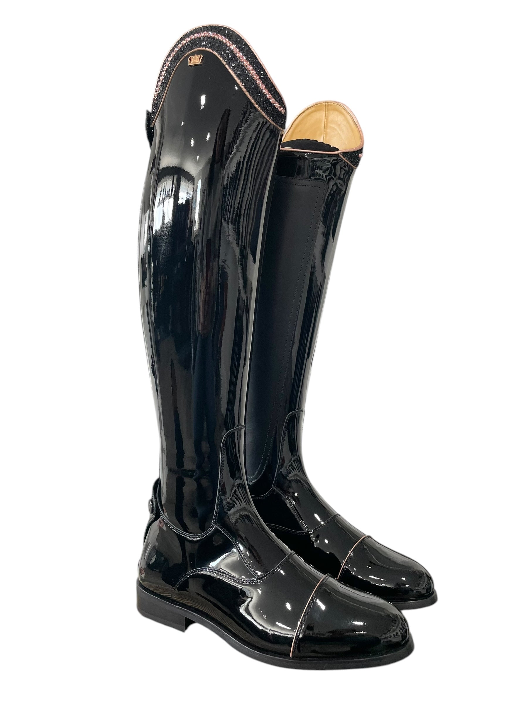 Description: Roma black base, black elastic along the shaft, Jenny top in grueso black with bronze rose piping and pink Swarovski crystal banding, toecap with bronze rose piping, rose gold logo crown, and black outsole.