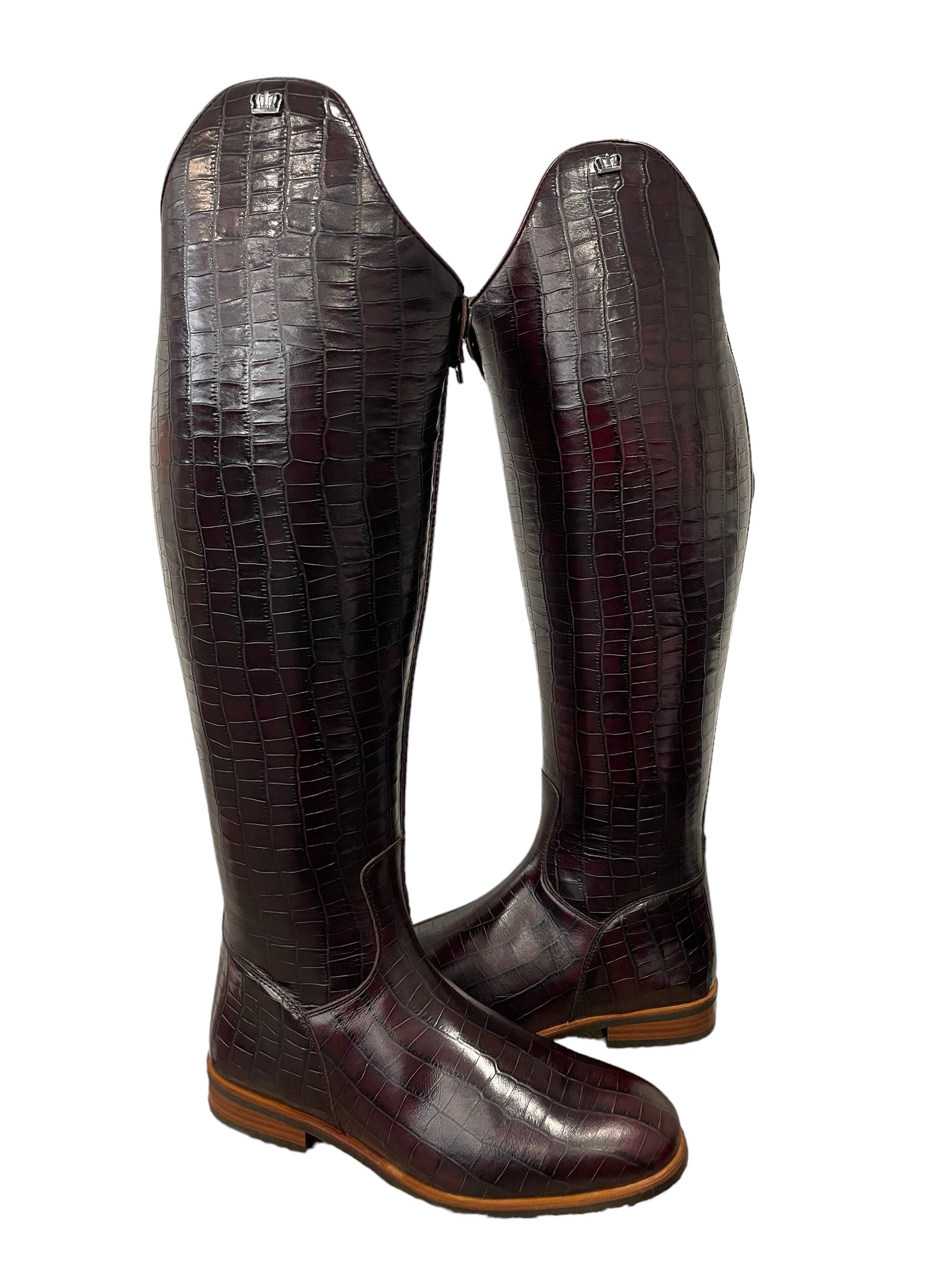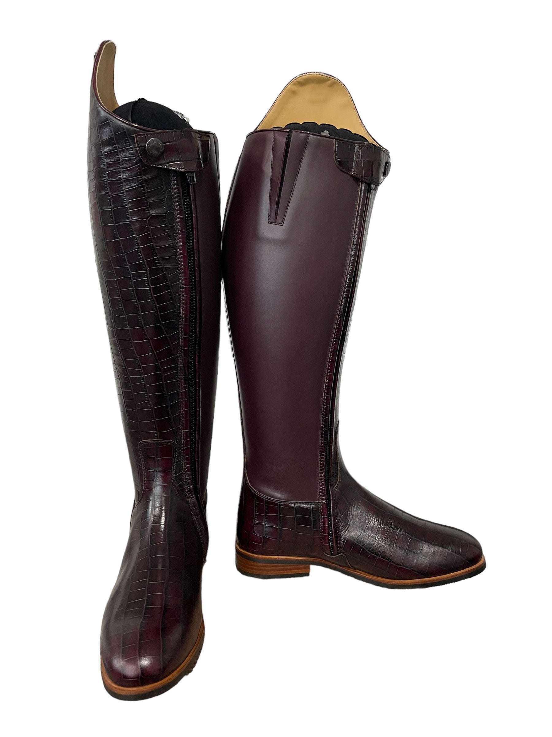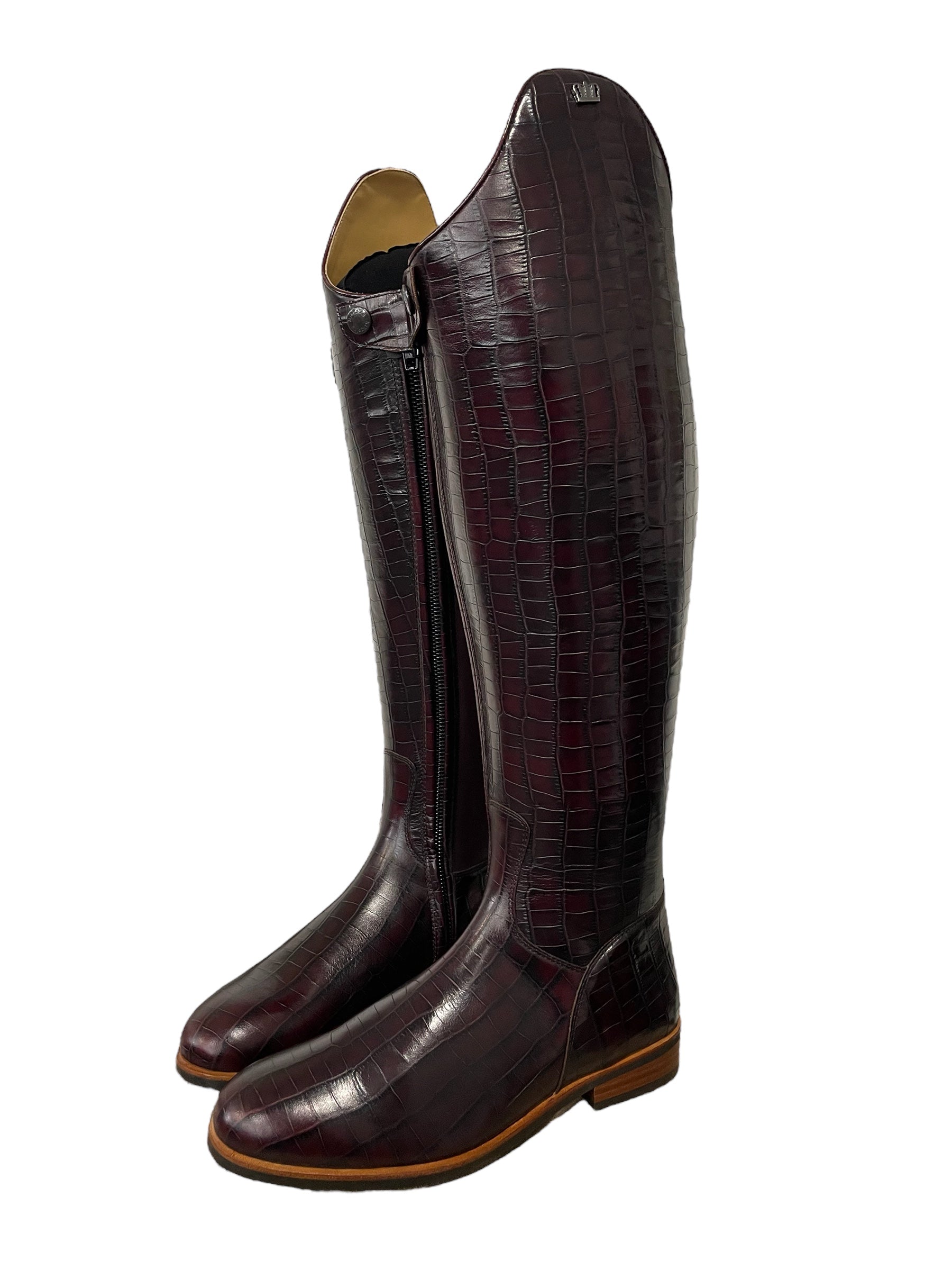 Description: Croco bordeaux base, nature bordeaux inside shaft, polished black logo crown, elastic gusset, and brown outsole.