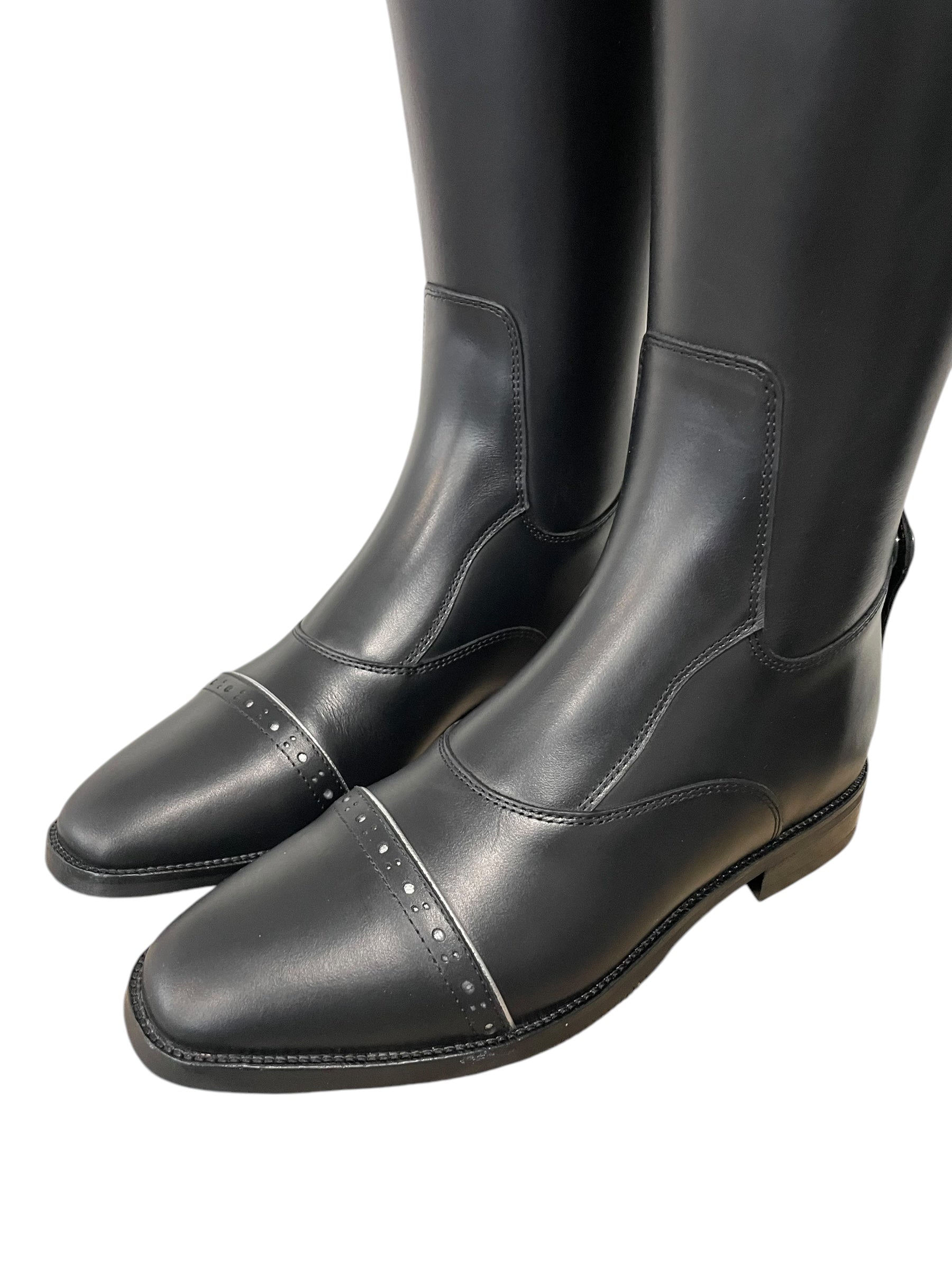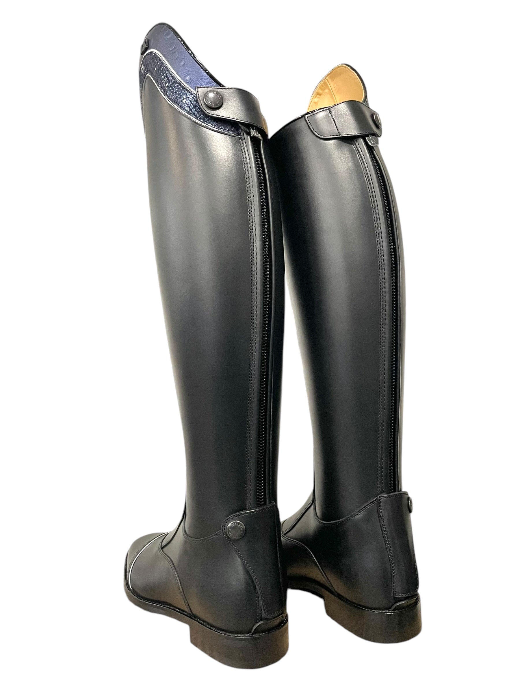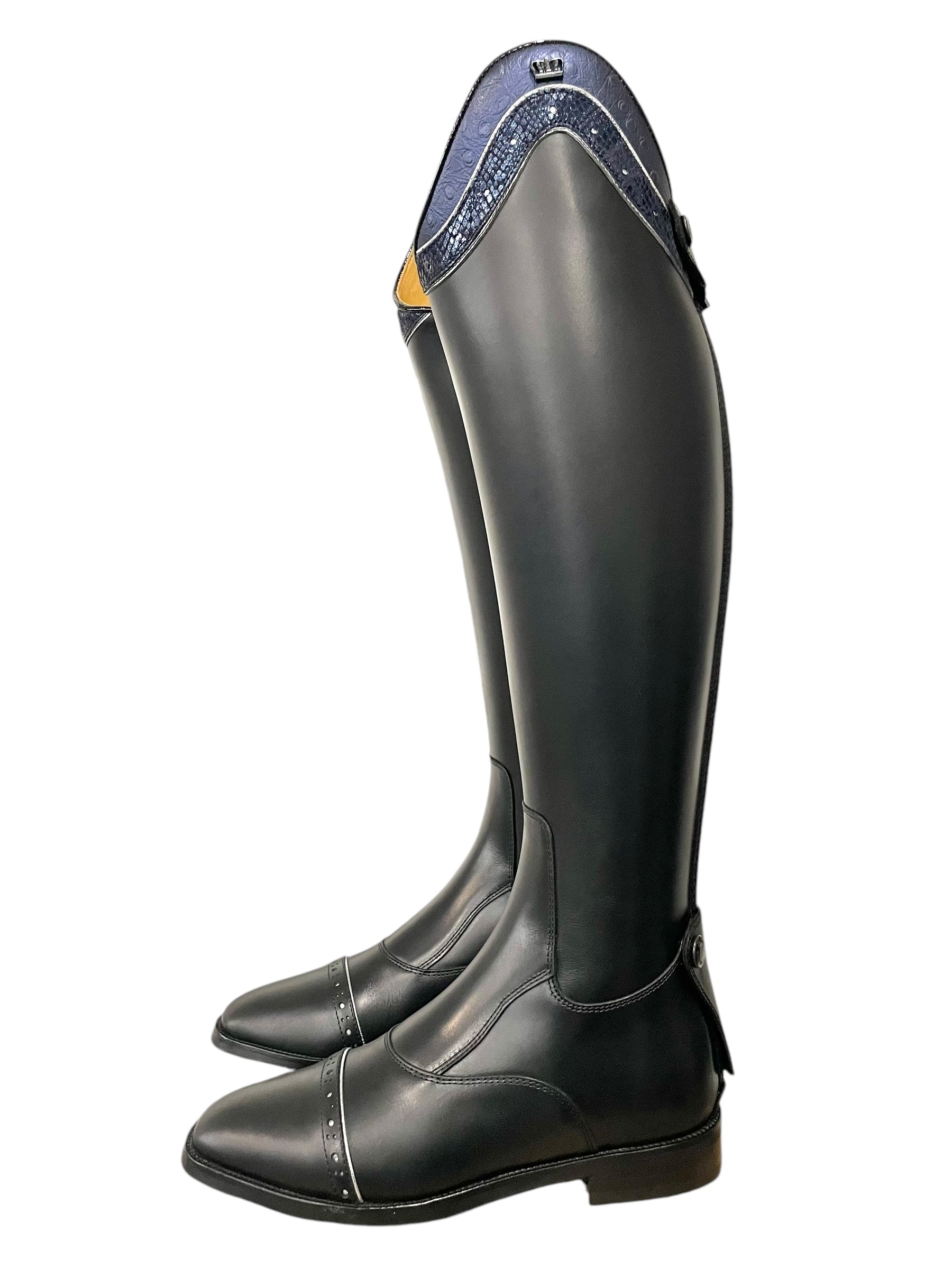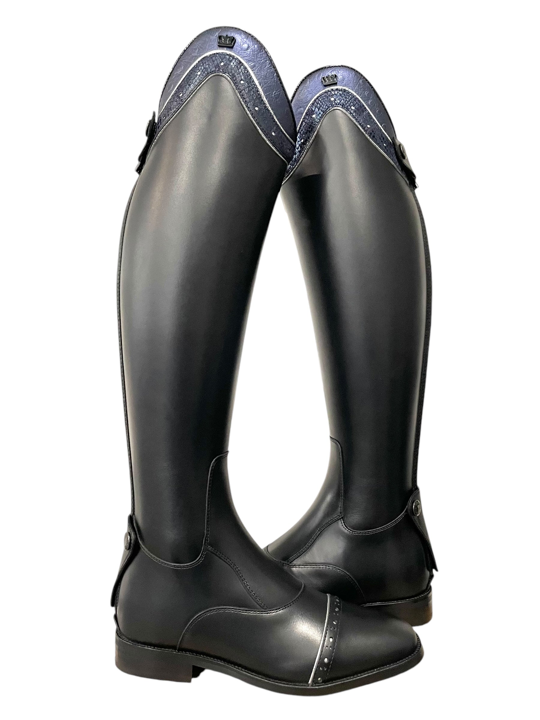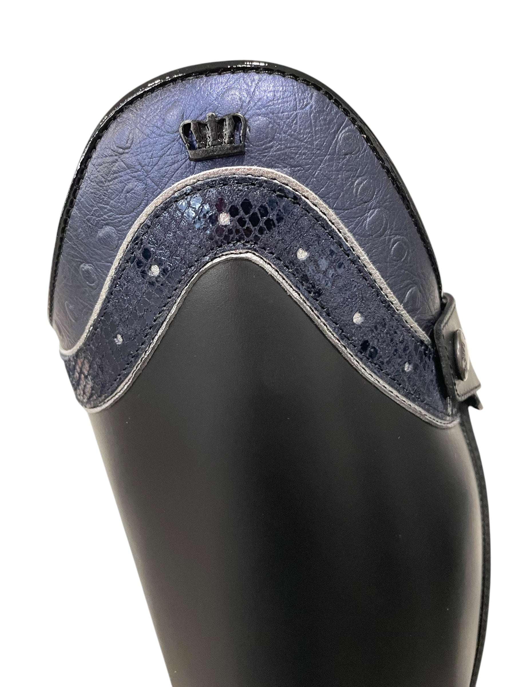 Description: Nature black base, Dulce top in ostrich blue and blue scales with silver, roma black top piping, toecap with brogues and silver piping, matte black logo crown, and black outsole.